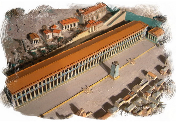 스토아는 노출된 공간이 열리는 기둥이 늘어선 회랑으로 덮여있었다. 스토아는 건물의 별관이거나 공공 광장 또는 거리를 따라있는 독립된 건축물이 될 수도 있다. 이 사진의 에우메네스 스토아(주랑 현관)(17)는 디오니소스 극장과 헤로데스 아티쿠스 오데이온을 연결했다. 이 주랑 현관은 다른 주랑 현관과 비교했을 때 엄청났다.