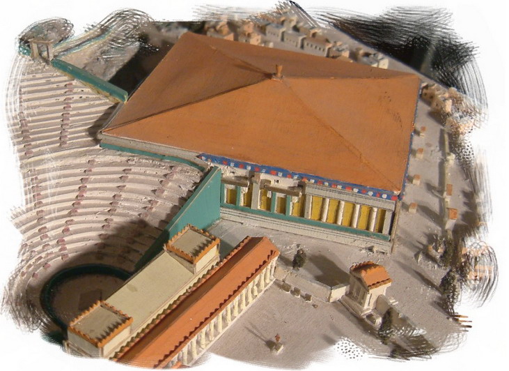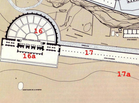 뮤지컬 경연대회와 비극적이고 희극적인 합창단 훈련에 사용된 페리클레스 오데이온(30)으로 알려진 이 거대한 건물은 실라의 포위 공격(BC 86년) 때 불타 없어졌고, 아리오바르자네스가 다시 지었다. 이 오데이온의 발굴은 아직 이루어지지 않았으며, 이 유적지에서 나오는 건축물은 매우 드물다. 귀퉁이 중 하나가 디오니소스 극장을 파고들었다.