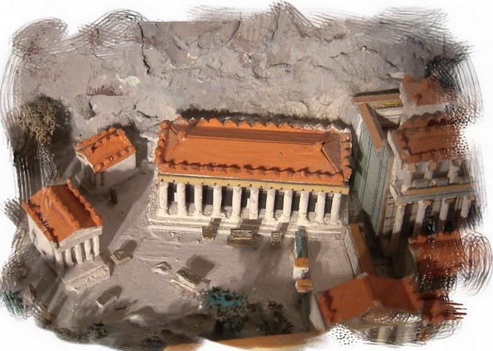 성소의 입구는 사진 오른쪽의 작고 좁은 신전의 입구(29)를 통과했다. 본당(28)은 열주식(파사드에만 기둥이 있음)으로 4개의 기둥을 세웠으며 앞쪽에 나타난다. 디오니소스 극장 건물에 기대어 있는 긴 주랑 현관(26)도 눈에 띈다. 마지막으로, 주랑 현관과 본당 사이에, 주랑 현에 거의 닿을 듯한 또 다른 작은 도리스식 신전(27)을 볼 수 있다.