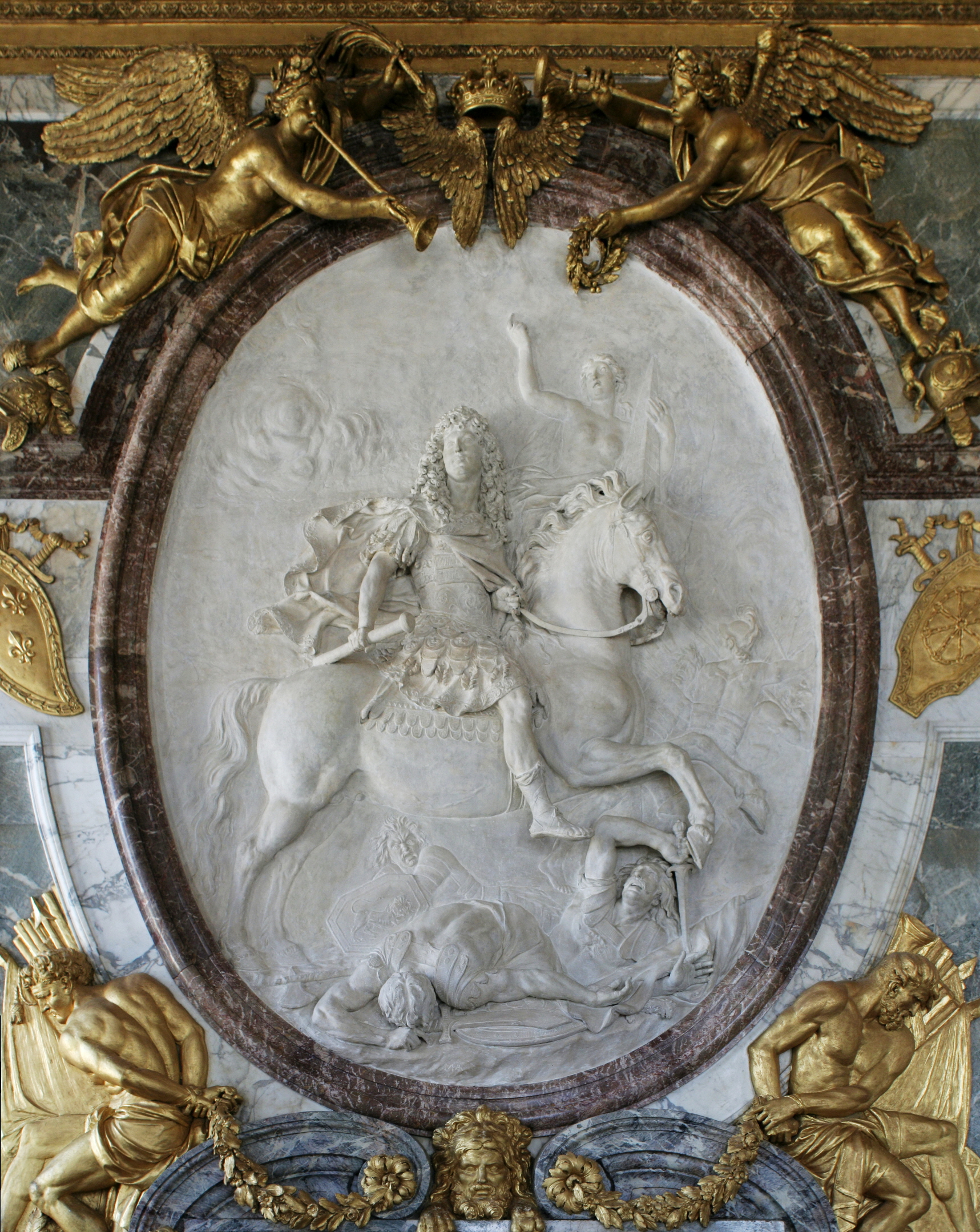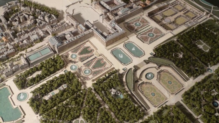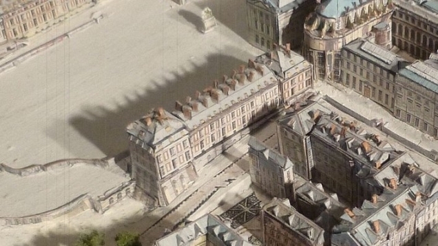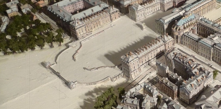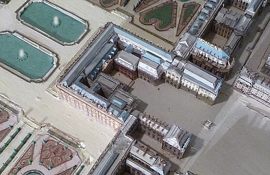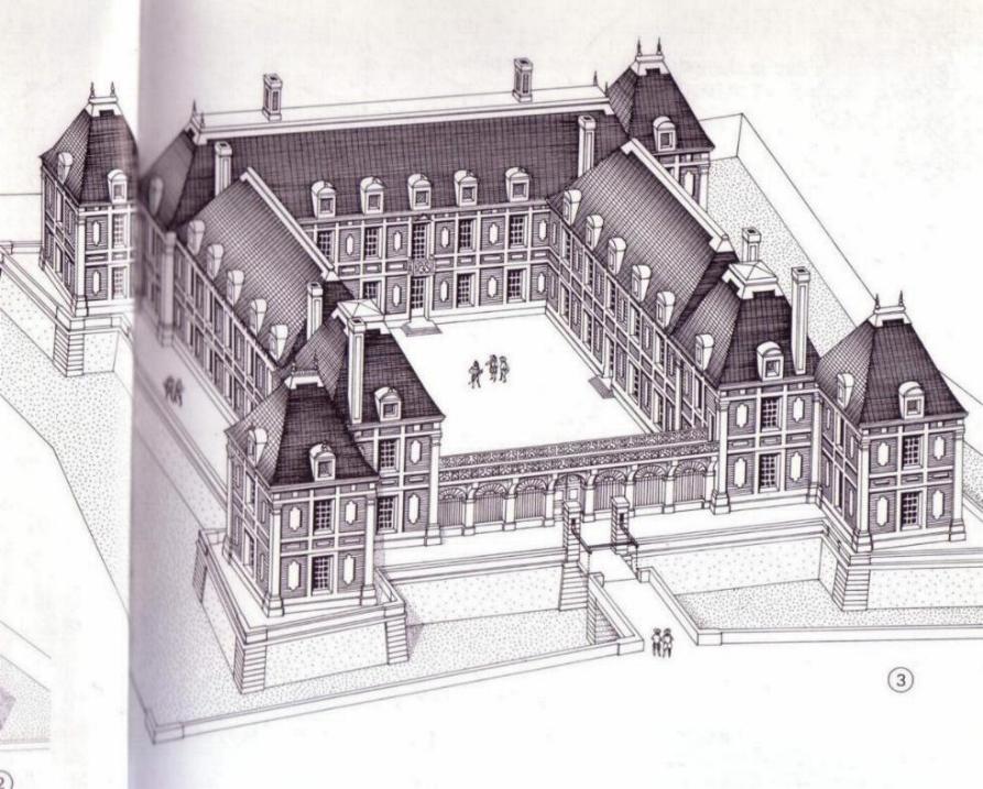 1668년 베르사유는 루이 14세가 처음으로 수행한 작업 이후, 이미 훨씬 더 웅장한 양상을 보이고 있다. 루이 13세의 작은 산장은 여전히 새로운 건축물의 시작점이며, 그중 두 개의 추가 날개는 훨씬 더 넓은 새로운 안뜰을 만들었다. 배경에 이미 정원의 비율과 최종 모양이 그려져 있다.