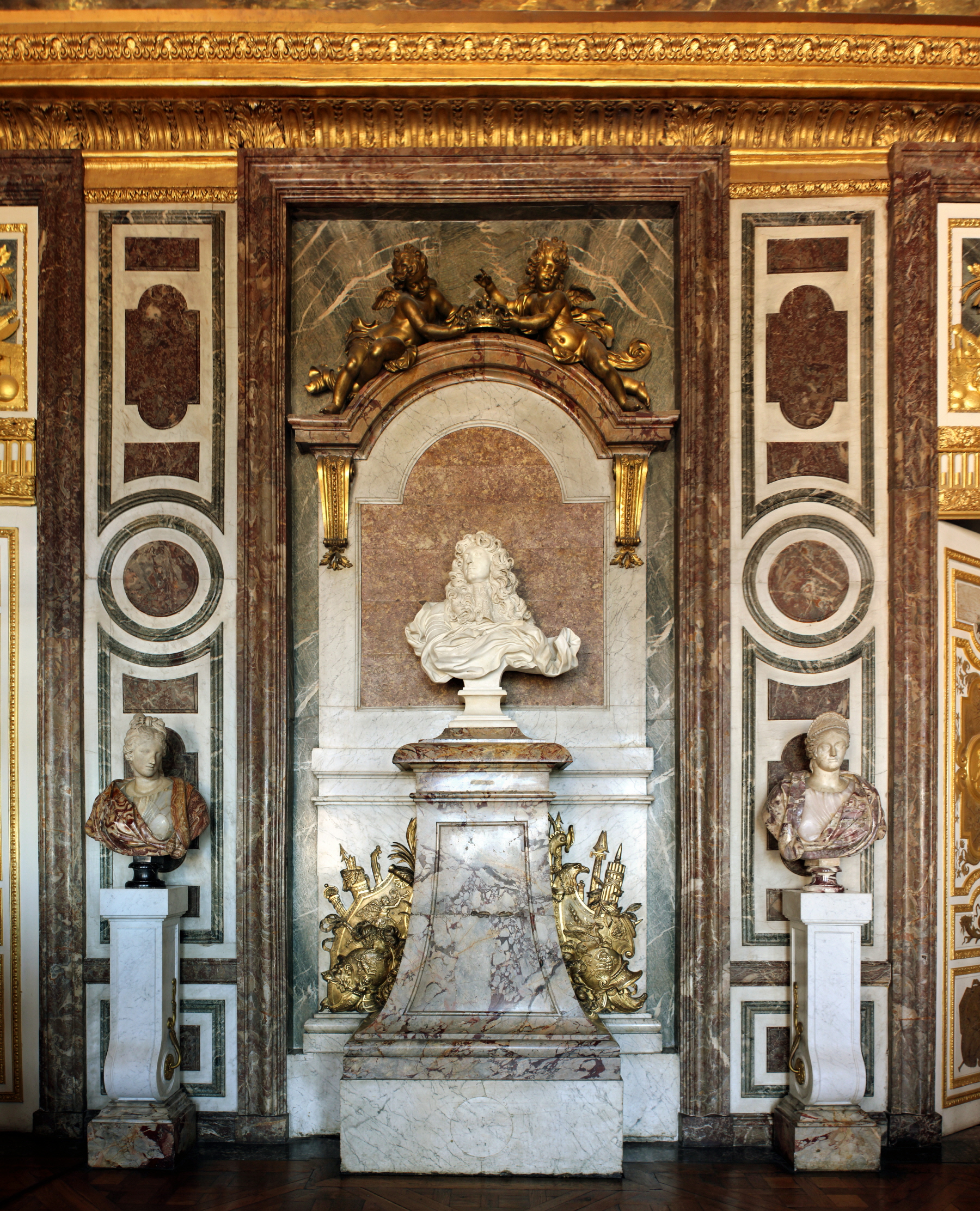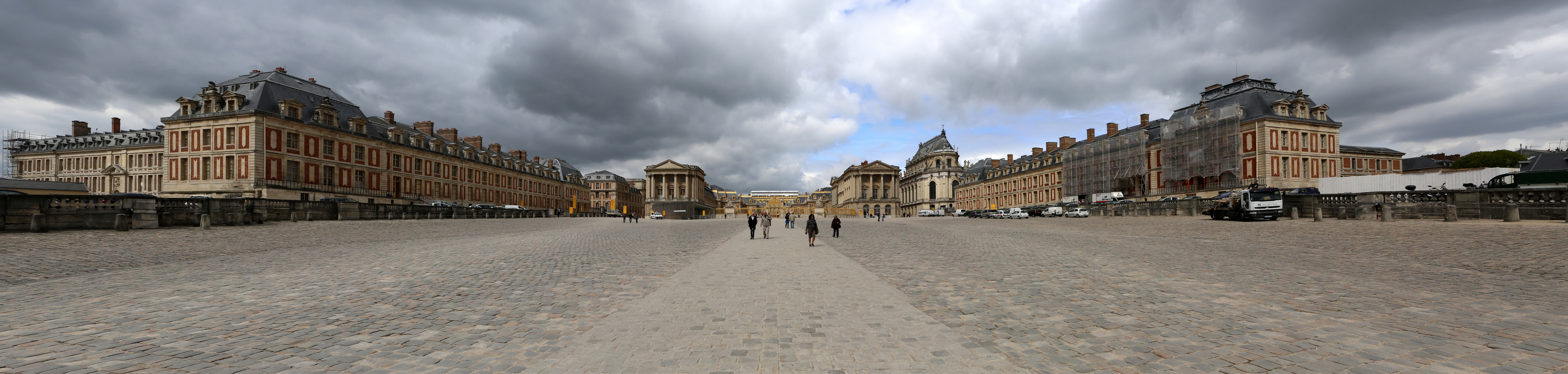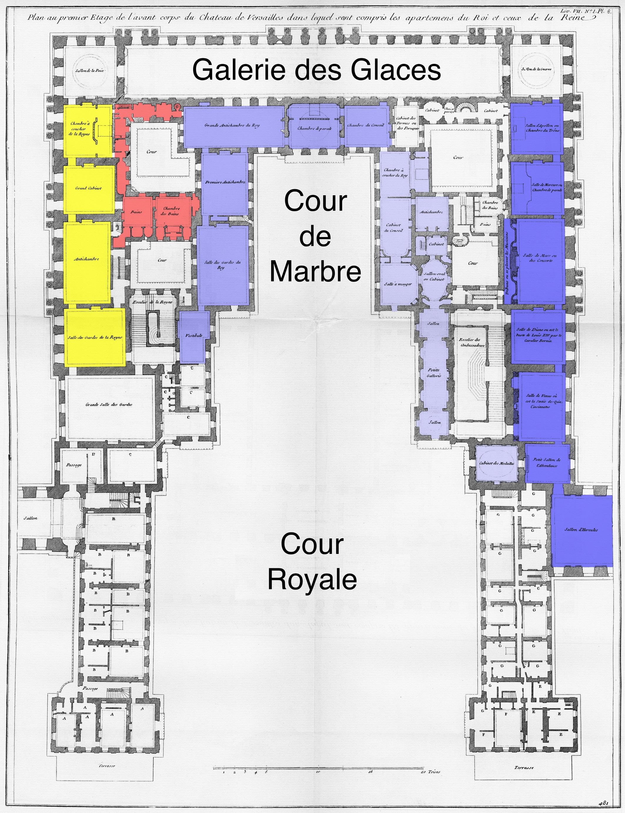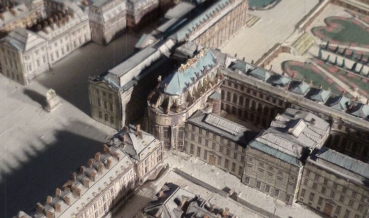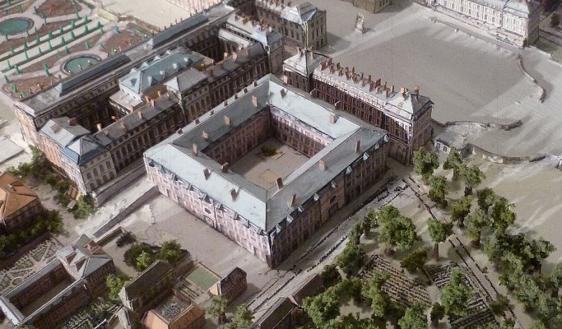 이 거대한 단지에서 루이 13세의 작은 사냥 산장을 상상하기 어렵다. 그러나 건물은 여전히 궁전 한가운데에 있으며 작은 대리석 안뜰의 뼈대가 되었다. 사실 루이 14세는 그의 건축가 루이 르 보와 건물의 감독관 콜베르의 제안을 거절했다. 콜베르는 이 작은 성을 "혼합"하는 방식을 피하기 위해 허물기를 원했다. 루이 13세가 지은 이 작은 성은 17세기에 산기슭에 마을이 있고 사방에 습지가 있는 언덕에 있는 작은 별장이었다. 사진은 두 개의 첫 번째 안뜰, 루이 13세 궁전의 심장부인 대리석 안뜰과 높은 귀족만이 코치와 함께 들어갈 수 있는 왕실 안뜰을 잘 보여준다.