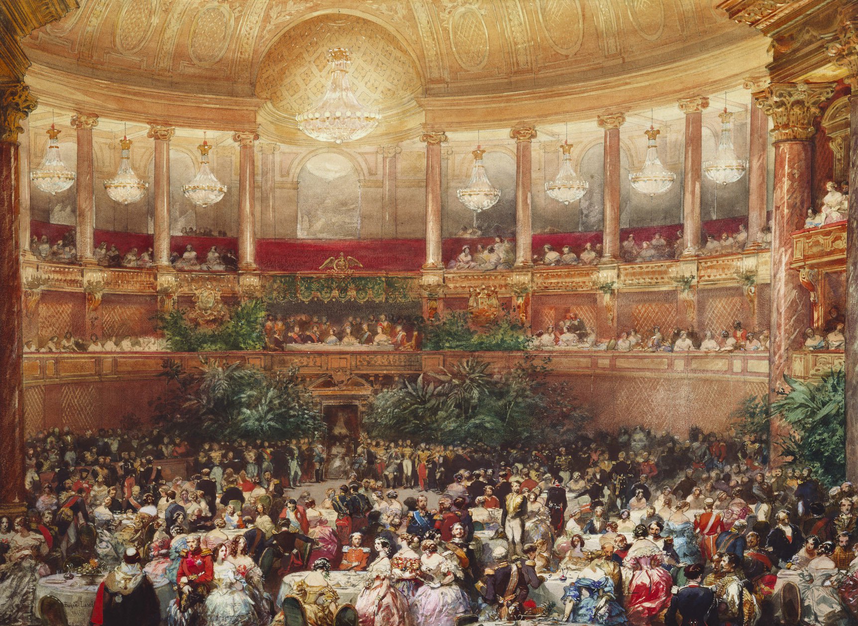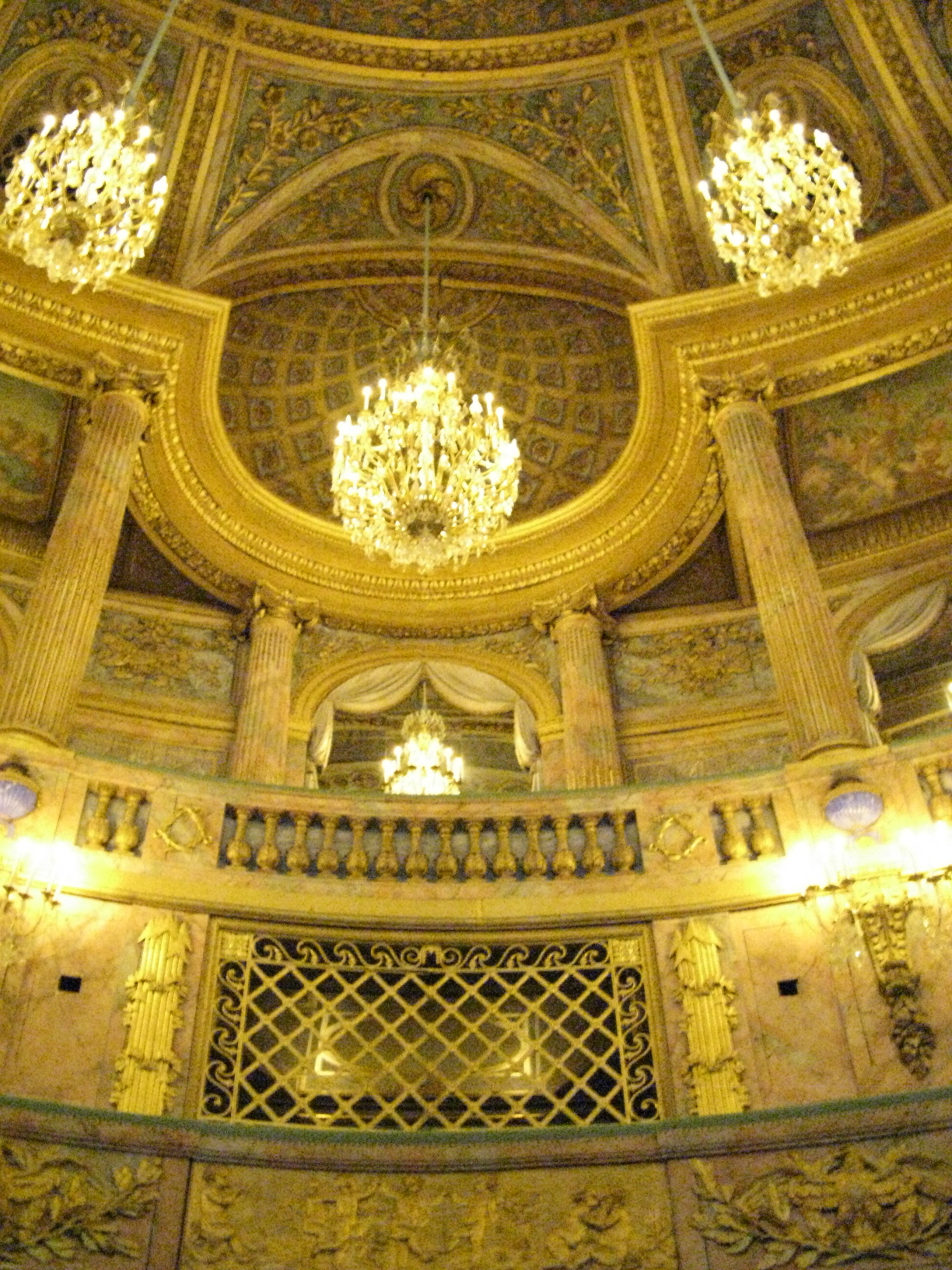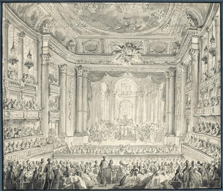 사진 중앙에 있는 베르사유 궁의 오페라는 저수지와 가까운 북쪽 날개의 끝에 지어졌다. 1770년 루이 15세가 그의 손자 루이 16세와 마리 앙투아네트 대공비의 결혼을 위해 개관했다. 7년 전쟁으로 인한 재정 문제로 건축가 가브리엘이 이 프로젝트를 이루기 위해서는 20년이 필요했다. 오페라 하우스는 공식 연회뿐만 아니라 콘서트와 무도회에도 사용되었다.