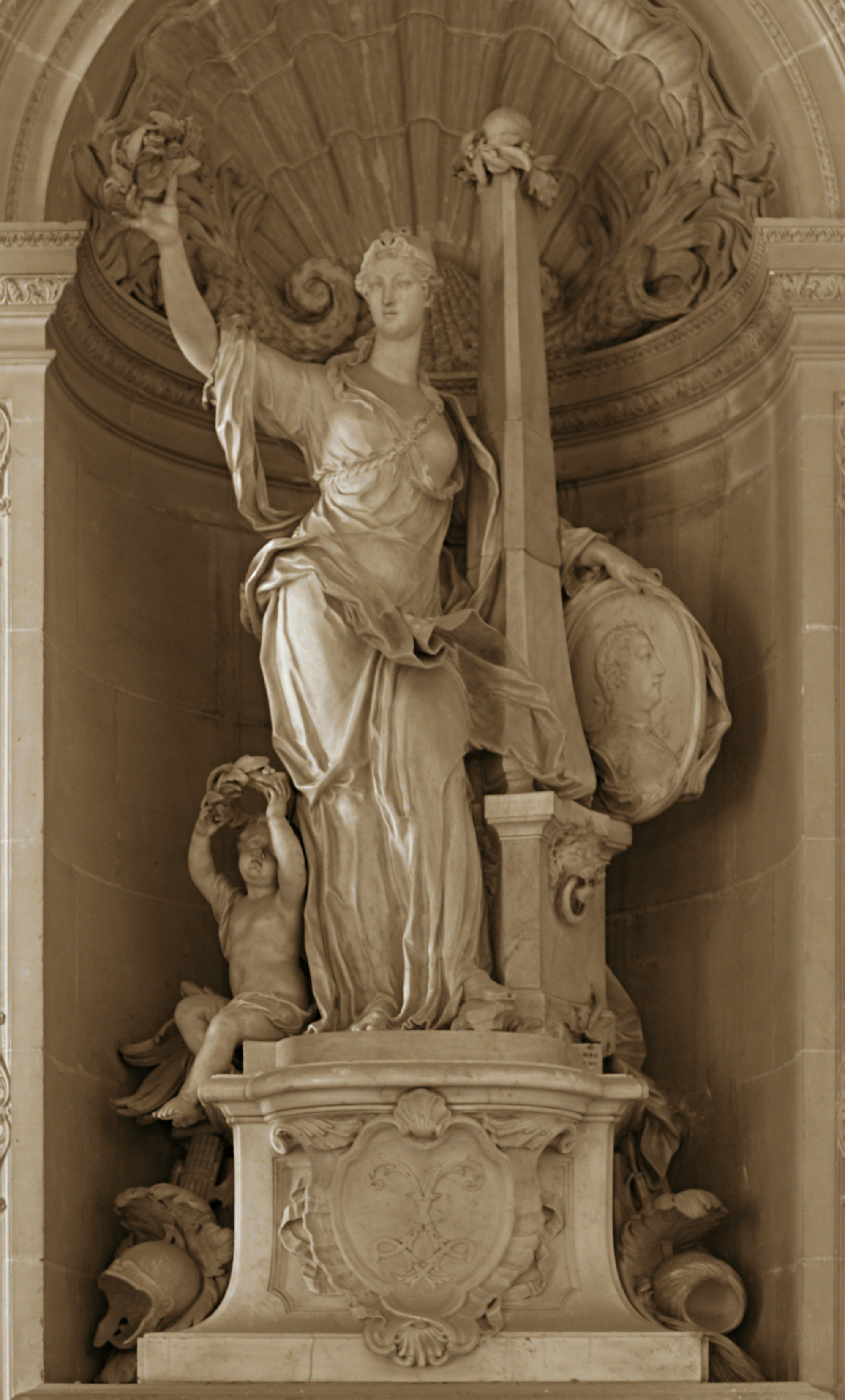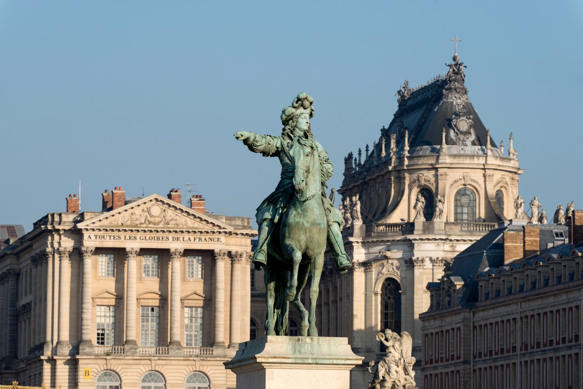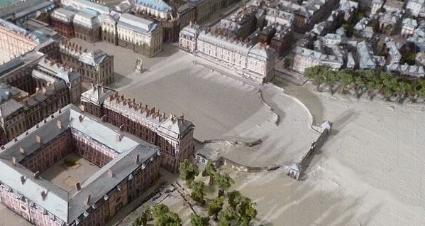 사진 중앙에는 두 개의 인접한 안뜰에 있는 각료들의 별관을 분리한 루이 14세의 기마 동상이 서 있다. 왼쪽의 왕실 안뜰은 궁전 쪽으로, 각료들의 안뜰은 울타리 쪽을 향했다. 오늘날 동상은 아흐므 광장에서 철거되어 파리 거리의 시작점으로 옮겨졌다.