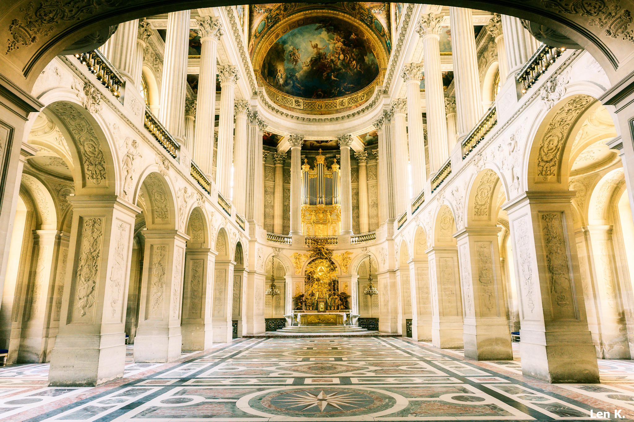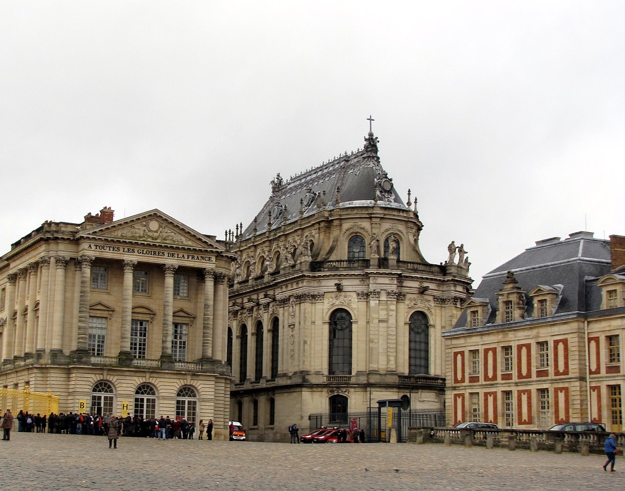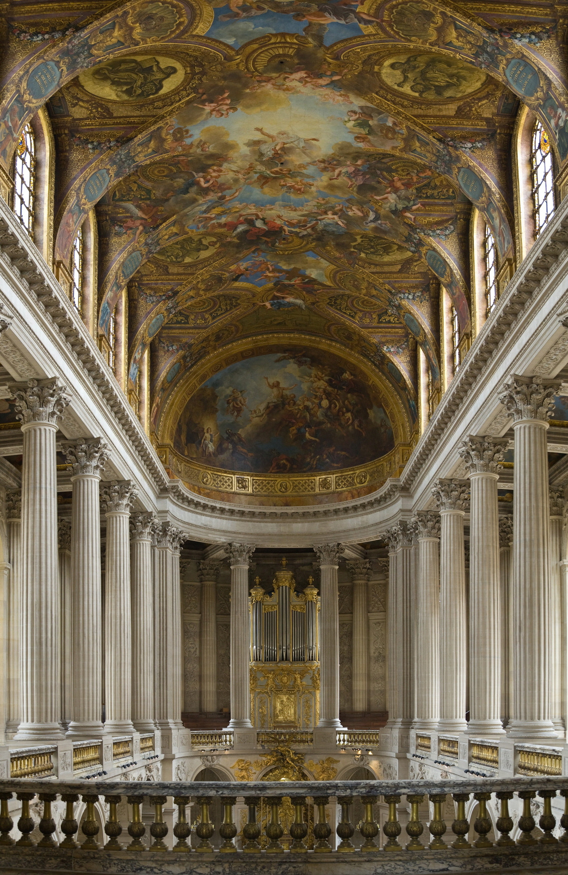 건축가 쥘 아르두망 망사르는 베르사유 궁의 예배당을 설계했다. 예배당은 1710년에야 완성되었다. 지붕의 능선은 안뜰보다 43 미터 위에 있다. 예배당은 왕의 위대한 아파트의 날개와 북쪽 날개 사이의 각도 옆에 있다. 지붕은 궁전의 다른 부분보다 높다.
