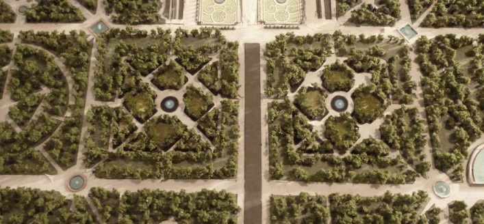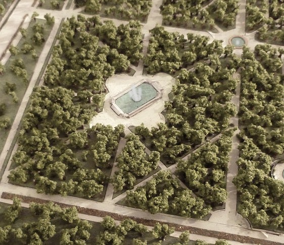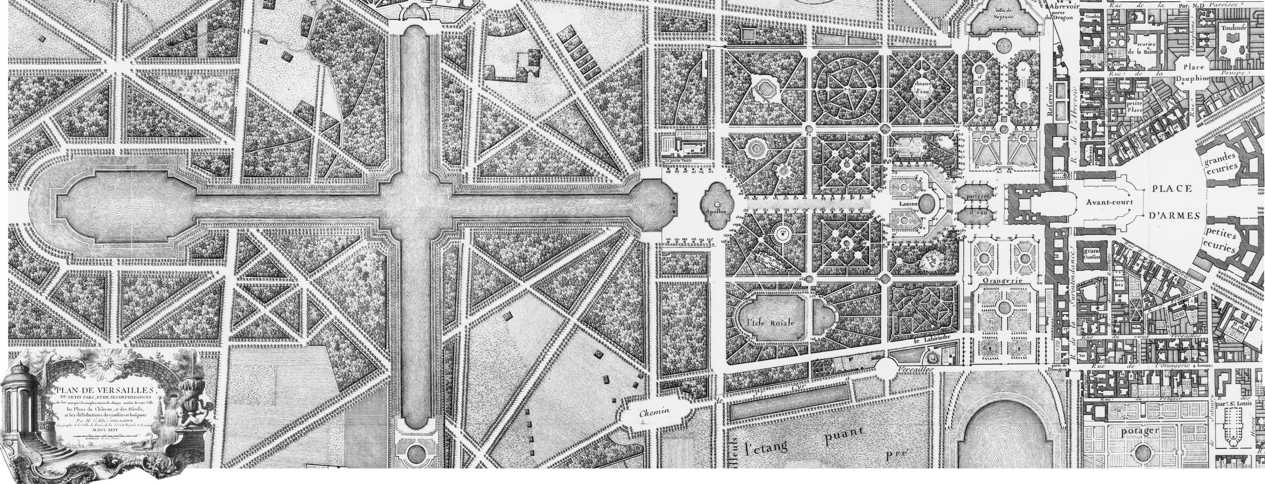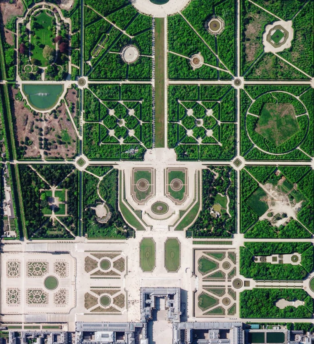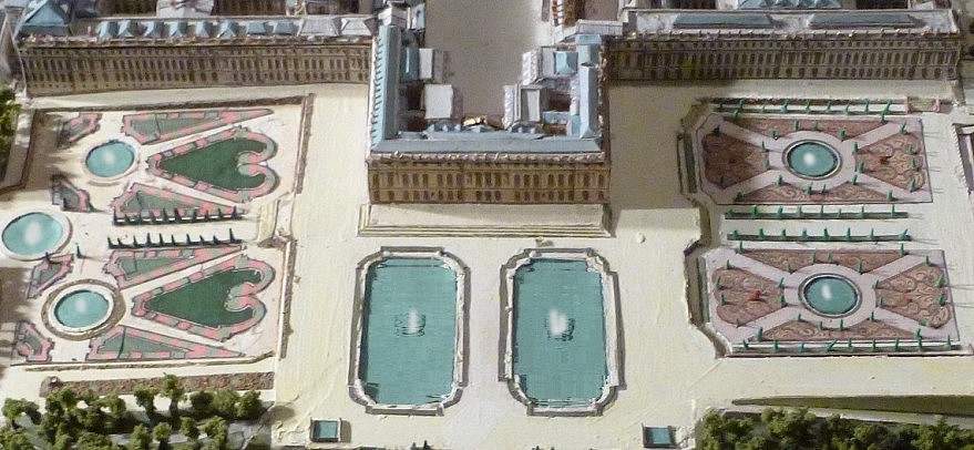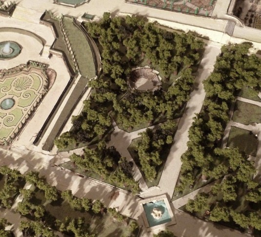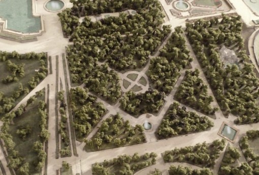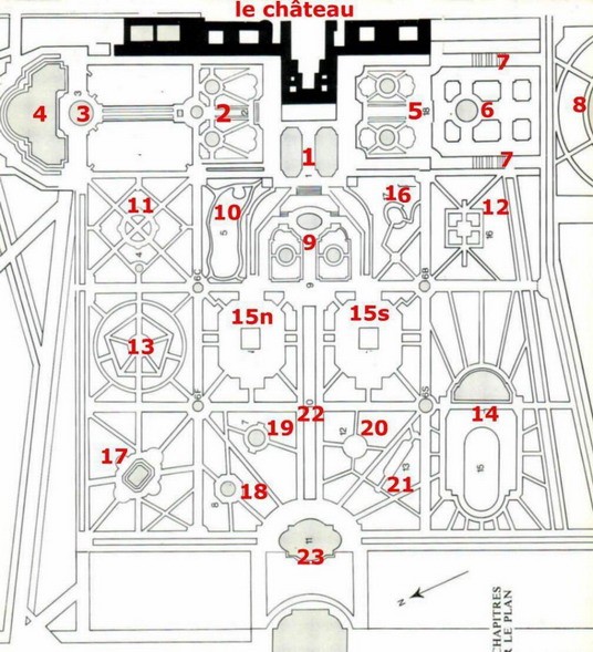 꽃잎 모양 정원은 사라진 숲을 대체했다. 남쪽의 꽃잎 모양 정원(오른쪽)(15s)은 루이 14세로 거슬러 올라가고 아마도 루이 15세의 통치 초기에 파괴되었을 오래된 지랑돌 숲을 대체했다. 북쪽의 꽃잎 모양 정원(왼쪽)(15n)은 지랑돌 숲과 짝을 이룬 오래된 도핀 숲을 대체했다.
