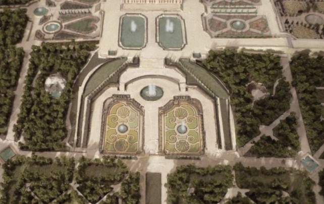 남쪽 화단(5)은 여왕의 창문 아래로 펼쳐졌다. 사진에 오랑주리 테라스가 나와 있고 그 너머에 스위스 호수가 있다.
