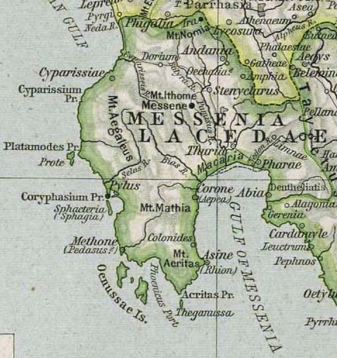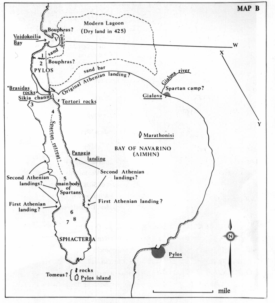 BC 425년 여름, 에우리메돈과 소포클레스가 지휘하는 아테네 함대는 데모스테네스를 고문으로 태우고, 아테네에서 출항하여 시켈리아에서 캠페인을 벌이고 코르키라에서 아테네의 민주 동맹군을 도왔다. 데모스테네스는 당시 공식적인 지위는 없었지만 425년 한여름에 시작되는 그리스의 해를 위한 스트라테고스 선출자였으며, 두 장군은 그가 원하면 펠로폰네소스 주변에서 함대를 사용할 수 있도록 하라는 지시를 받았다. 일단 함대가 바다로 나가자 데모스테네스는 이전에 비밀로 유지했던 계획을 밝혔다. 그는 전진 전초기지로서 특히 유망하다고 믿고 있는 필로스에 상륙하여 요새화 하기를 원했다. 필로스는 스파르타로 진군하기에 좋은 거리에 있었고 나바리노 만의 훌륭한 항구를 이용할 수 있었다. 장군들은 이 계획을 거부했지만, 데모스테네스는 폭풍이 불었을 때 운 좋게 함대를 필로스의 해안으로 몰았다. 그때도 장군들은 곶의 요새화 지시를 거부했고 데모스테네스는 군대와 부하 지휘관들에게 직접 호소하려 할 때도 마찬가지로 거부당했다. 폭풍이 지나가기를 기다리는 지루함으로 인해 비로소 그들은 요새를 쌓기 시작했다. 일단 작업이 시작되자, 아테네군은 열심히 빠르게 작업했고, 곶은 며칠 안에 요새화 되어 방어할 수 있게 되었다. 함대는 스파르타 함대 60 척이 운용되고 있는 코르키라를 향했고 데모스테네스는 새로운 요새를 방어하기 위해 5 척의 배와 선원들과 병사들을 남겼다.