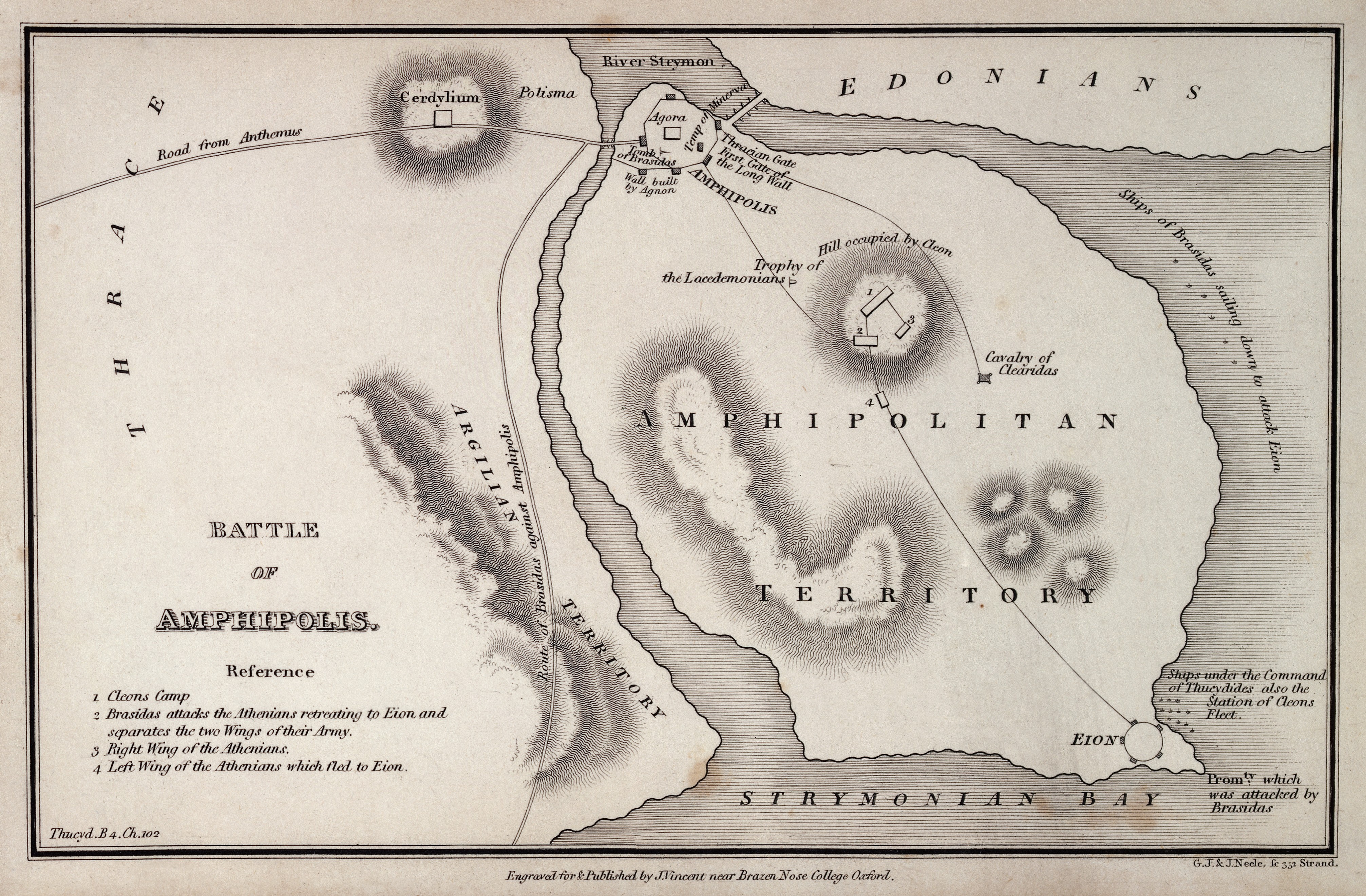 펠로폰네소스 전쟁사에서 암피폴리스 점령을 회고했던 투키디데스는 종종 암피폴리스 함락의 일부 또는 전적인 책임이 있는 것으로 여겨진다. 비록 그가 도시를 구하기 위해 제시간에 도착할 수 없었다고 주장되지만, 일부는 그의 행동을 "중과실"로 보았다. 그는 아테네로 소환되어 재판을 받고 추방되었다.