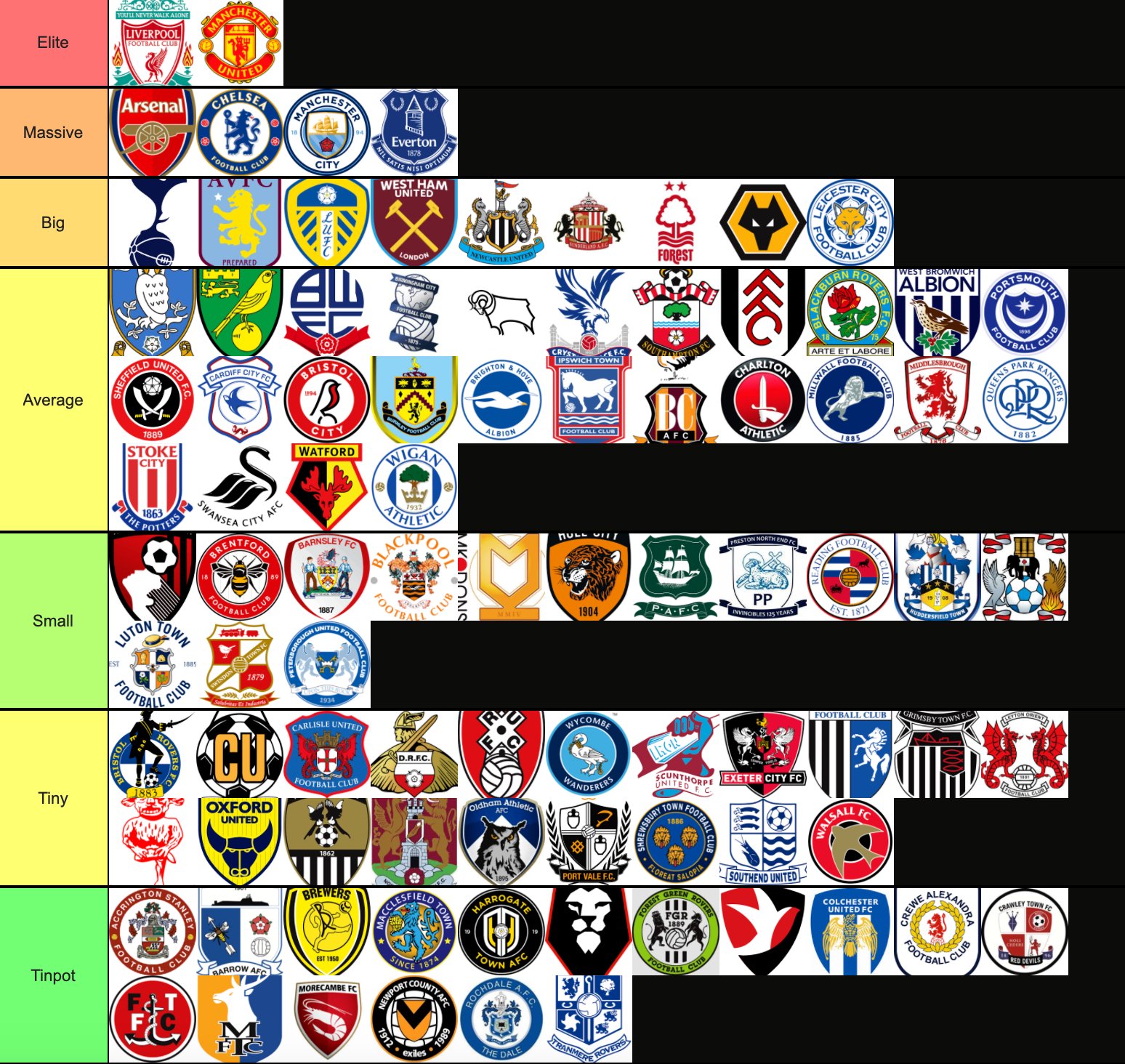 잉글랜드 축구 4개 디비전에 속한 92개 팀 모두 "엘리트"(지배적인)에서 "틴팟"(별 볼일 없는)까지 순위가 매겨졌다.