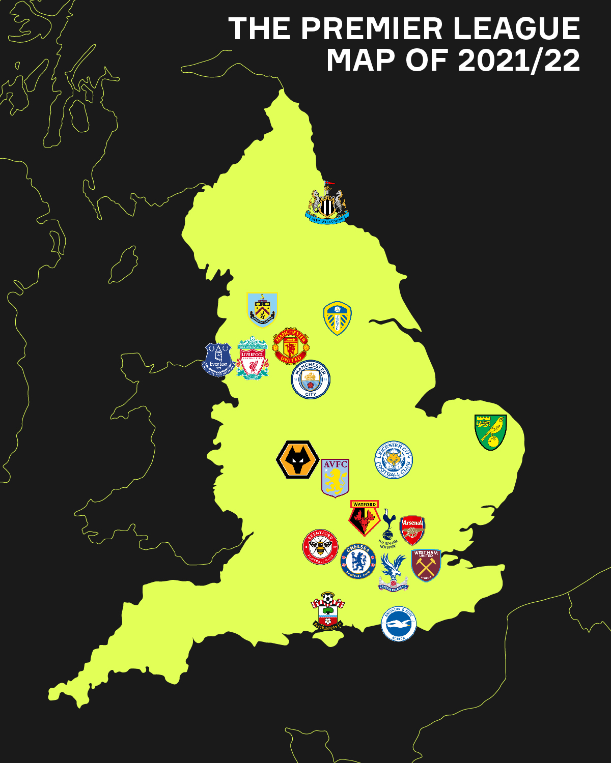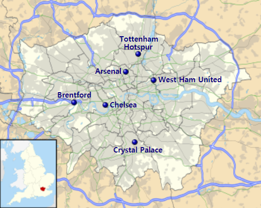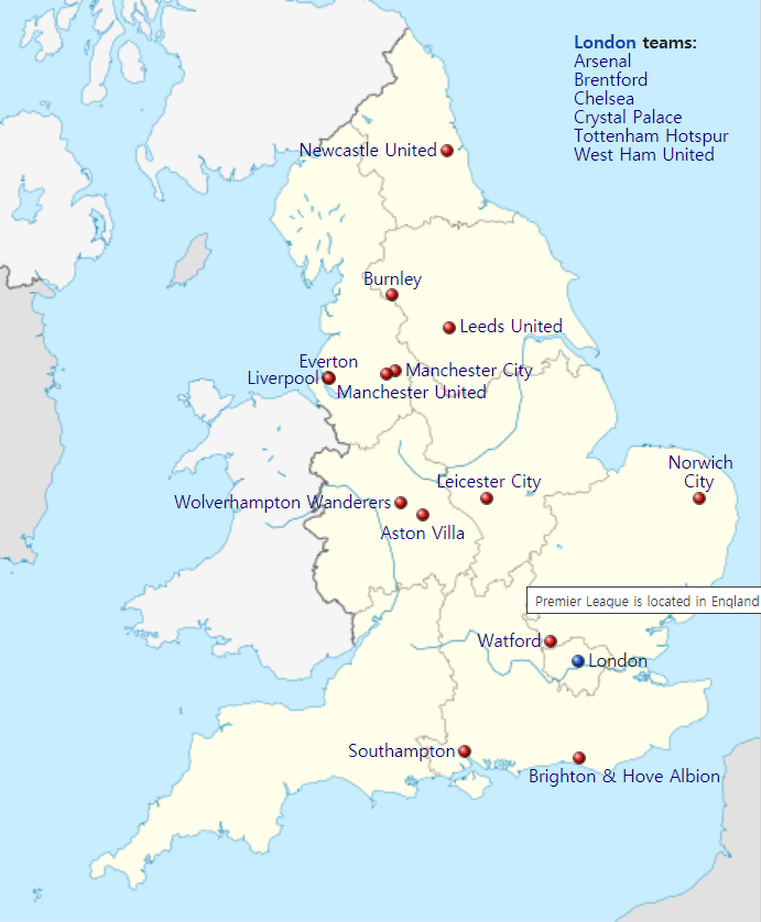 프리미어리그 클럽 분포를 엠블럼으로 묘사 / 프리미어리그 클럽의 연고지를 나타낸 지도 / 런던 클럽들