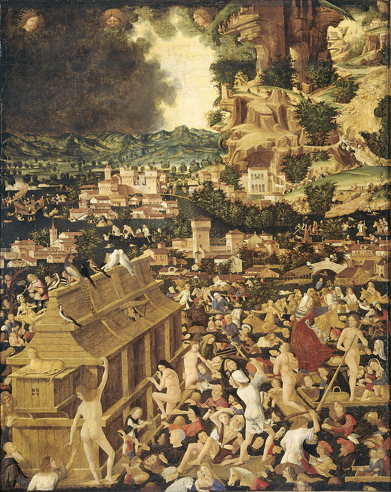 노아는 의로운 사람이었고 하나님과 동행했다. 땅이 부패하고 폭력으로 가득 찬 것을 보시고 하나님은 노아에게 방주를 지으라고 하셨다. 방주 안에는 그와 그의 아들들과 그들의 아내와 모든 생물의 수컷과 암컷이 물에서 구원받을 수 있었다. 노아는 육백 세 되던 해에 방주에 들어갔고, 그 해 두 번째 달 17일에 "큰 깊음의 샘들이 터지며 하늘의 창들이 열려" 40 주야를 비가 내리고, 가장 높은 산들의 깊이가 15 규빗에 이르렀고 노아와 함께 방주에 있던 자들을 제외한 모든 생물이 죽었다.