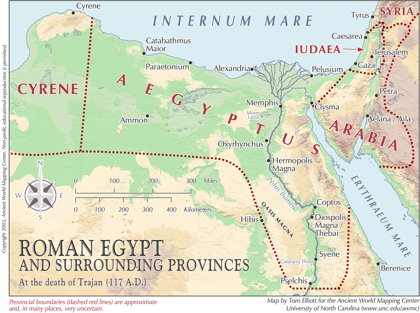 BC 44년 율리우스 카이사르가 암살된 후, 알렉산더 대왕의 정복으로 아케메네스 왕조(제31왕조)가 멸망된 후 이집트를 지배했던 프톨레마이오스 왕국(BC 305-30년)은 로마 공화국의 마지막 전쟁에서 마르쿠스 안토니우스의 편을 들었고 악티움 해전에서 마르쿠스 안토니우스와 파라오 클레오파트라 7세를 무찌르고 BC 27년에 아우구스투스가 된 로마의 초대 황제 옥타비아누스와 맞서 싸우게 되었다. 안토니우스와 클레오파트라의 죽음 이후, 로마 공화국은 이집트의 프톨레마이오스 왕국을 합병했다. 아우구스투스와 그 이후 많은 황제들이 로마인 파라오로서 이집트를 통치했다. 프톨레마이오스 제도는 해체되었고, 일부 관료적 요소가 유지되었지만, 정부 행정은 사회 구조와 함께 완전히 개혁되었다. 헬레니즘 시대의 그리스 이집트 법체계는 계속 사용되었지만 로마법의 테두리 안에서 이루어졌다. 프톨레마이오스의 수도 알렉산드리아에서 주조된 테트라드라크몬(4드라크마 은화) 주화는 계속 화폐화가 되었지만 그 가치는 로마 데나리우스와 동등하게 되었다. 고대 이집트 신들의 사제직과 이집트의 헬레니즘 종교는 대부분의 신전과 특권을 지켰고, 사제들은 신격화된 황제들과 그 가족들에 대한 로마 제국의 숭배에도 봉사했다.
