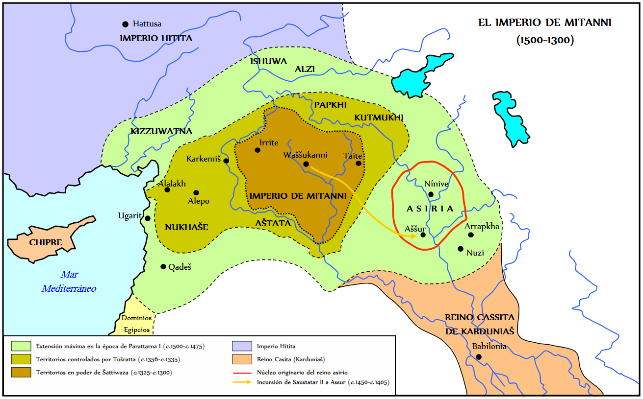 역사가 시작될 때 미탄니의 주요 라이벌은 제18왕조의 이집트였다. 그러나 히타이트 제국이 부상하면서 미탄니와 이집트는 히타이트 지배의 위협으로부터 상호 이익을 보호하기 위해 동맹을 맺었다.