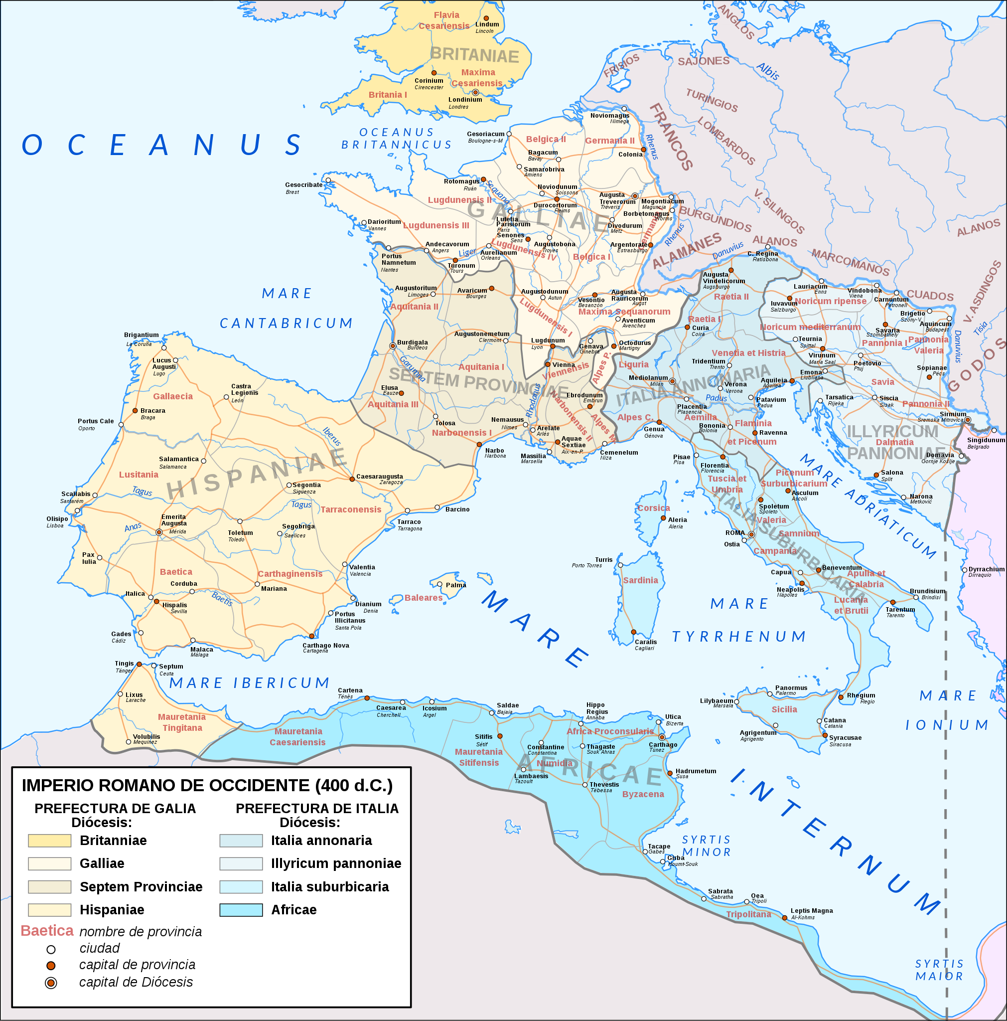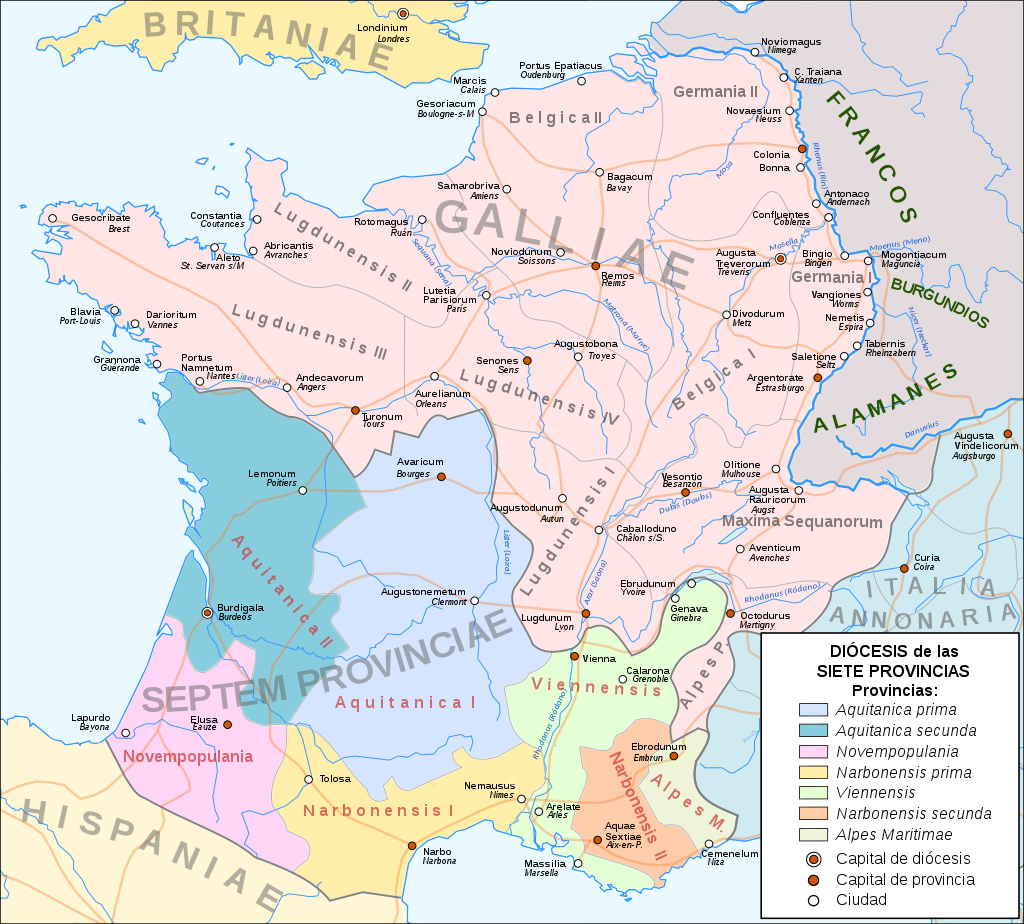 전기 로마 갈리아는 3세기 후반에 끝이 났다. 외압은 내부의 약점을 악화시켰고 라인 강 국경을 방치한 결과 야만인의 침략과 내전으로 이어졌다. 잠시 동안 히스파니아와 브리타니아를 포함한 갈리아는 (포스투무스에서 시작된) 별도의 황제 계통의 통치를 받았다. 그러나 독립을 위한 움직임은 아직 없었다. 제국을 구하기 위해 디오클레티아누스는 293년 갈리아 아퀴타니아와 갈리아 나르보넨시스로 구성된 갈리아 남부에 비엔넨시스 관구를 설립하면서 속주를 재정비했다. 동시에 아퀴타니아 프리마는 주도를 아바리쿰 비투리굼(부르주)에, 아퀴타니아 세쿤다는 부르디갈라(후대의 보르도)에, 노벰포풀라니아("아홉 민족의 땅")로 더 잘 알려진 아퀴타니아 테르티아는 엘루사(오즈)에 두는 세 개의 속주로 나뉘었다. 노벰포풀라니아는 일종의 분리된 정체성을 유지했던 원래의 아키타니아를 위해 카이사르가 설정한 경계에서 비롯되었다(로마에 대한 베루스의 임무는 별도의 속주를 요구하는 것을 목표로 했다). 이러한 구조조정 이후 갈리아는 안정을 누리고 명망을 높였다. 406년 12월 31일 4개 부족(알라니족, 수에비족, 아스딩족, 실링반달족)이 라인 강을 횡단하여 침공한 뒤, 라인 강 국경이 이후에 복원되었으며 프랑크족이 쾰른을 점령하는 459년까지 로마의 통제 하에 있었음에도 불구하고 갈리아 행정 구역의 수도를 트리어에서 아를로 옮겼다. 로마인은 침략자들을 통제하고 지중해를 그들로부터 보호하기 위해 남쪽으로 관심을 돌렸지만 반달족이 420년대 초부터 히스파니아 남부를 근거지로 하여 해안 지방을 괴롭히기 시작한 이후 정책은 실패했다.