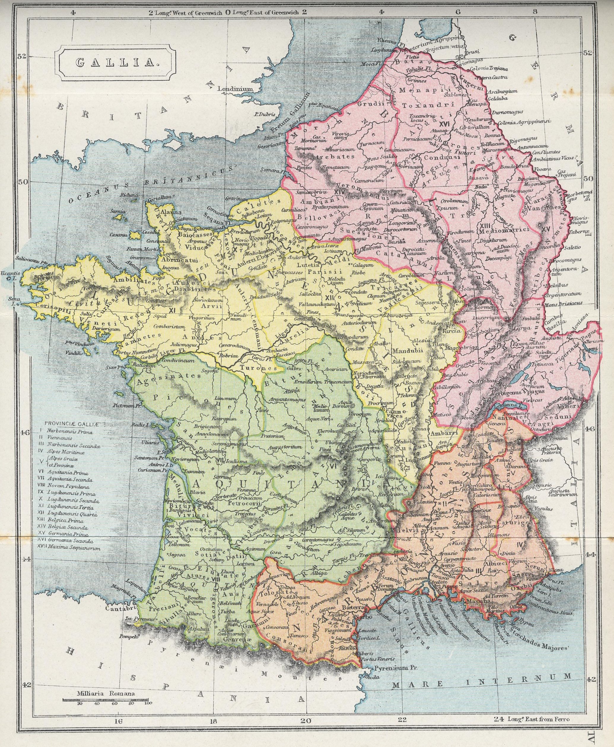 국가로서의 갈리아는 자연적인 단위가 아니었다(카이사르는 적절하게 갈리아(켈타이), 벨가이와 아퀴타니로 구분함). 히스파니아로 가는 경로를 보호하기 위해 로마는 마살리아(마르세유)를 도와 접경하고 있는 부족에 맞섰다. 이 개입 이후, 로마인은 BC 121년에 프로빈키아 또는 "속주"라 부르는 곳을 정복했다. 프로빈키아는 지중해에서 제네바 호수까지 확장했고, 이후 나르보에 주도를 둔 나르보넨시스로 알려졌다. 이 지역 중 일부는 여전히 로마식 이름을 떠올리며 오늘날의 프로방스에 속한다.