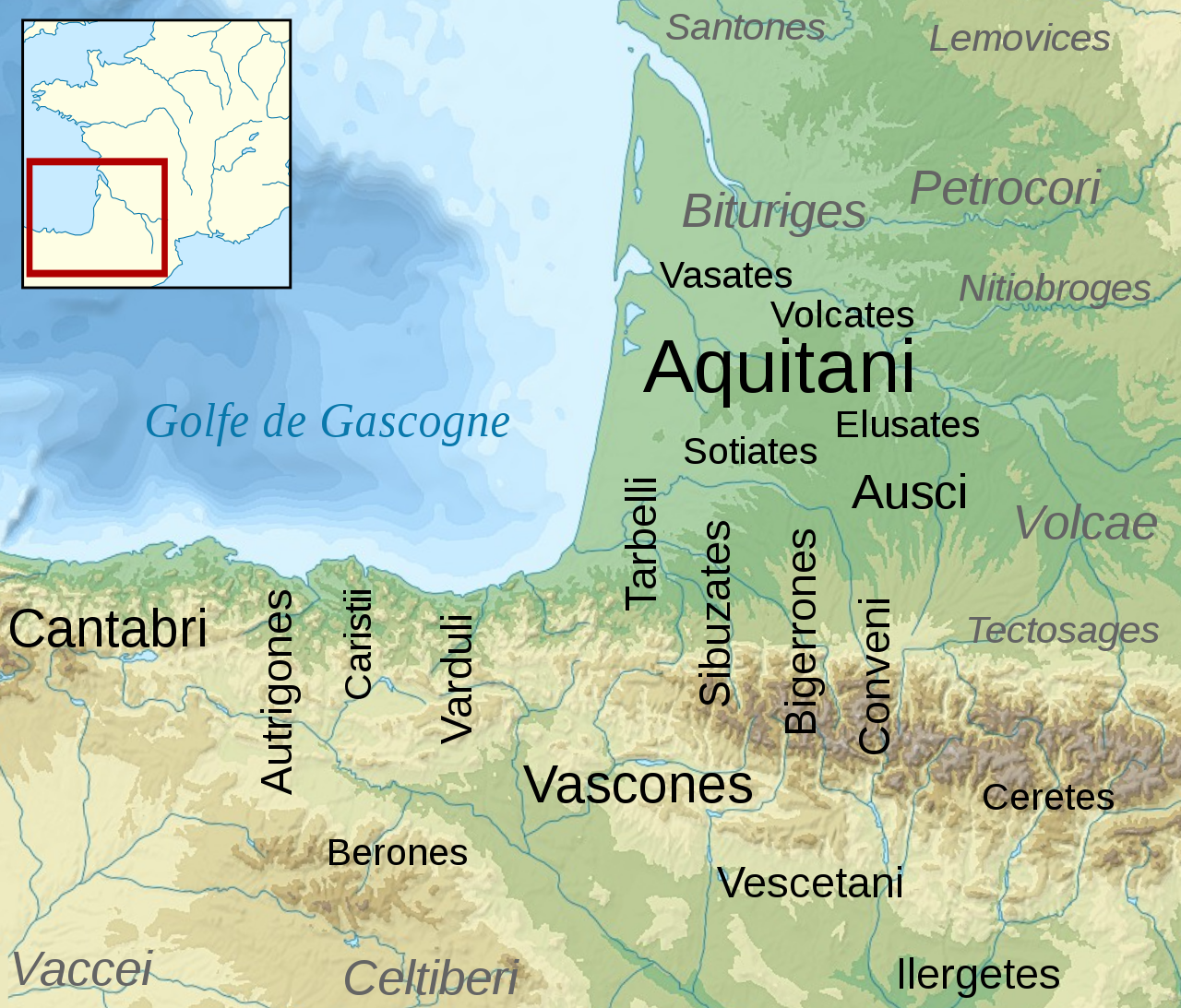 14개의 켈트 부족과 20개 이상의 아퀴타니아 부족이 남쪽의 피레네 산맥 북쪽 비탈에서 북쪽의 리게르(루아르) 강까지 이르는 지역을 차지했다. 아퀴타니족은 20개 이상의 부족이 있었지만, 그들은 수가 적고 평판이 좋지 않았다. 대부분의 부족은 바다를 따라 거주했고, 나머지 부족은 내륙과 켐메누스 산맥의 정상과 텍토사게스까지 있었다.