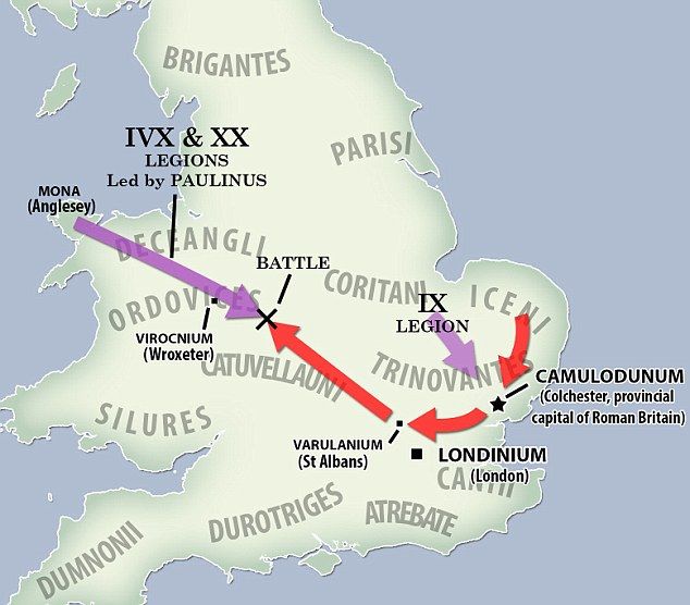 아울루스 플라티누스의 캠페인 지도와 BC 43년부터 60년까지 로마의 브리타니아 캠페인을 나타낸 지도. 43년부터 시작된 브리타니아 정복은 저명한 원로원 의원인 아울루스 플라티우스의 지휘 하에 시작되었다. 전체 병력은 불분명하며 60/61년의 부디카 반란에 3개 군단이 동원되었다고 알려져 있다. 로마군은 필요시 협조 군단과 보조 부대가 이동하여 유동적이었다. 보노니아(오늘날 불로뉴)에서 출항한 아울루스 플라티우스의 군은 세 부대로 나뉘어 교차했다. 카물로두눔(콜체스터)이 신설 브리타니아 속주의 주도가 되었다. 47년 말 새로 부임한 지휘관 푸블리우스 오스토리우스 스카풀라는 오늘날의 웨일스와 체셔 평원에 대한 캠페인을 시작했다. 웨일스 부족들은 경계 지대를 맹렬하게 방어했으며 52년, 오스토리우스가 전사하고 디디우스 갈루스가 부임했지만 북쪽이나 서쪽으로 더 이상 확장하지 않았다. 아마도 클라우디우스는 이득이 없는 산악 지대의 전쟁을 피하고 싶어 했을 것이다.