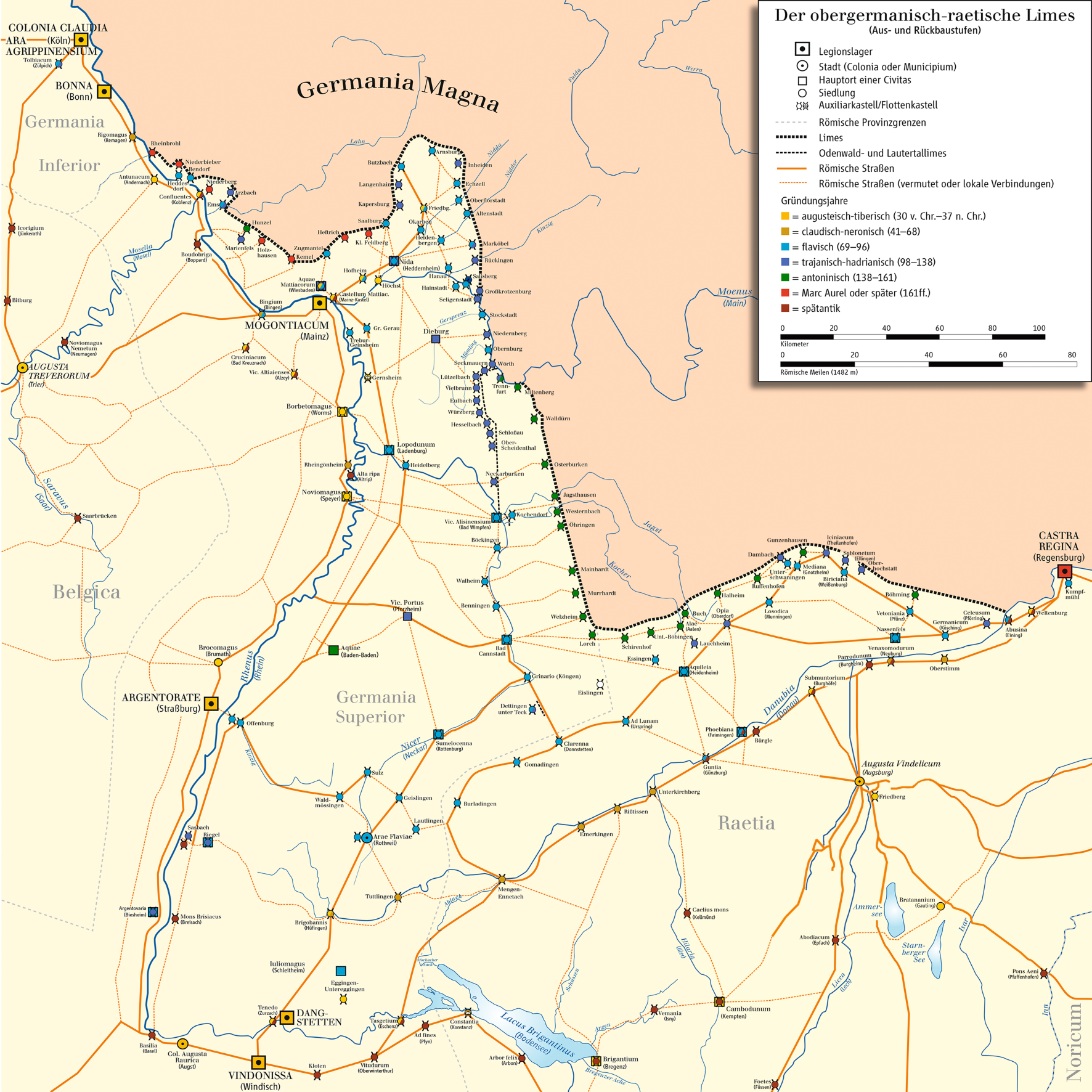 리메스는 강과 같은 자연 경계부터 일반적으로 흙으로 된 둑이나 나무 목책과 감시탑을 사이에 두고 배수로를 만들었다. 그 뒤로는 연결된 요새가 건설되었다. 플라비우스 왕조 시대에 수많은 거점과 후방에 더 큰 요새가 세워졌다. 도미티아누스가 시작하고 하드리아누스가 강화한 라인 강과 다뉴브 강을 연결하는 리메스는 나무 목책으로 구성되었다.