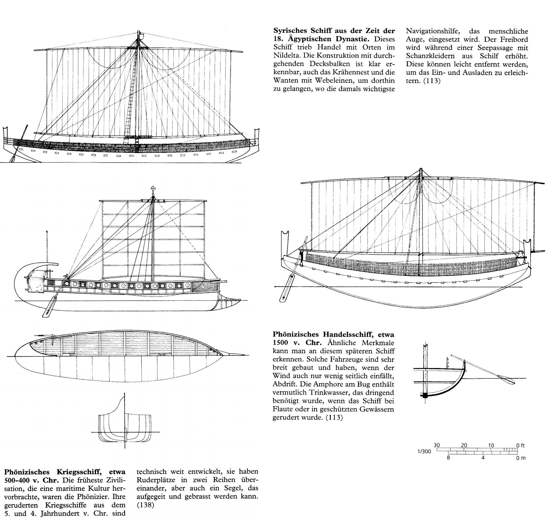 티레 항구에서 온 사람들이 가장 먼저 그렇게 한 것 같다. 그들의 배, 넓은 들보 모양의 낫 모양의 "둥근 배" 또는 갈로이는 선체의 굴곡진 넓은 곡선과 종종 두 개의 돛을 무거운 돛대에 매달고, 하나는 선체 중간 지점에, 그리고 하나는 선수 꼭대기 가까운 곳에 돛을 달고, 놀랍게도 솜씨 좋게 깎은 삼나무 널빤지로 만들어졌으며, 장붓구멍과 장부 이음으로 전체를 고정하고 타르로 밀봉했다. 티레, 비블로스, 시돈에서 온 대부분의 장거리 선박에도 노 젓는 사람이 있었다. 더 작은 무역선의 경우 양쪽에 7개, 큰 선박의 경우 양쪽에 13개의 이중 단이 있어서 엄청난 가속력을 제공했다. 배의 장식은 웅장하고 종종 의도적으로 위협적이었다. 후대의 서양 선원들에게 사랑받던 풍만한 가슴의 여성들과 대조적으로 뱃머리에 그려진 거대한 눈, 많은 이빨을 가진 용과 포효하는 맹수는 금속 램을 가지고 있었다.