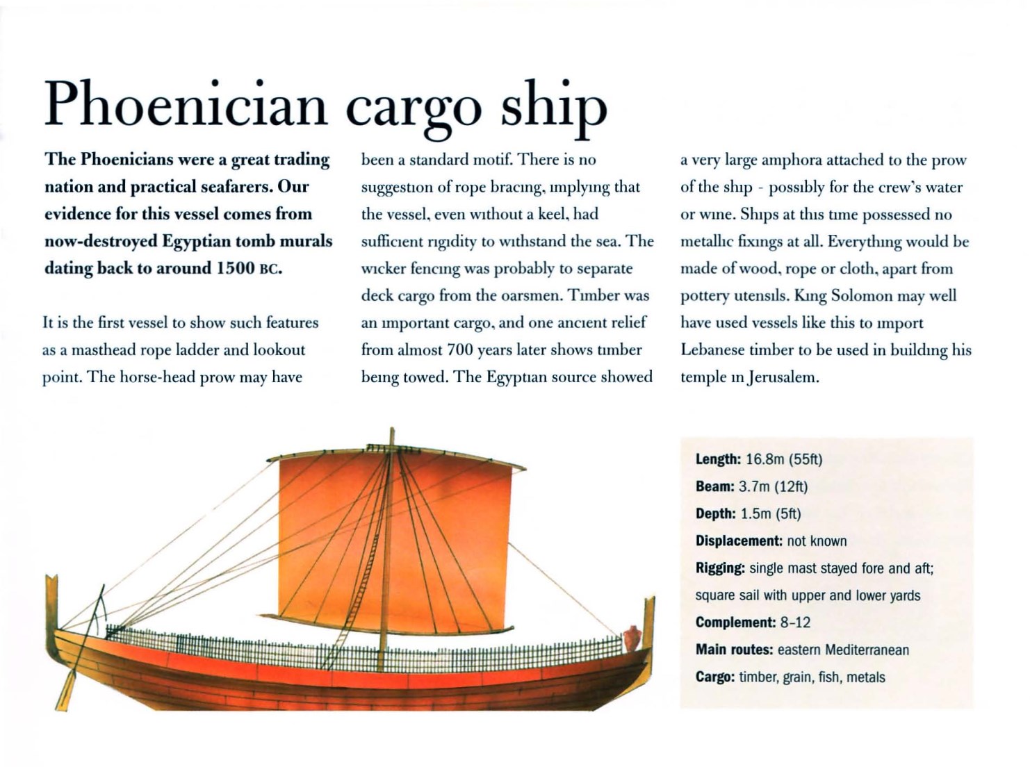 페니키아 선박은 무역을 위해 만들어졌다. 1982년 터키 남부의 울루부룬에서 스펀지 다이버가 발견한 유명한 청동기 시대의 난파선(확실히 페니키아의 것은 아니지만 그 시대의 전형적인 배)은 지중해에서 구할 수 있는 교역 물품의 웅장한 선택과 앞으로 펼쳐질 광대한 여정 모두를 보여주었다. 이 특별한 항해에 참가한 선원들은 분명히 그녀(배를 지칭)를 이집트, 키프로스, 크레타, 그리스 본토, 심지어 아마도 스페인까지 데려갔을 것이다. 그들이 침몰했을 때, 아마도 갑작스러운 폭풍으로 화물이 이동했을 때, 45 피트 길이의 갤로이의 선창에는 존 메이스필드가 상상할 수 있었던 것보다 훨씬 더 많이 당황스럽고 치명적 이게도 기쁨을 주는 것이 많이 담겨 있었다. 구리와 주석 주괴, 파란색 유리 및 흑단, 호박, 타조 알, 이탈리아 검, 불가리아 도끼, 무화과, 석류, 네페르티티의 이미지가 있는 금 풍뎅이, 아마도 배의 목수의 것일 가능성이 가장 높은 청동 도구 세트, 1톤의 테레빈스 수지, 주전자와 꽃병, 피토이로 알려진 그리스 저장 항아리, 은과 금 귀걸이, 수많은 램프, 커다란 상아 보관함 등이 있었다.