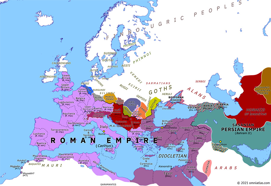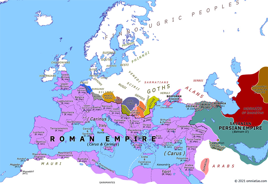 카루스와 그의 왕조 시대의 로마 제국. 카루스는 다뉴브에서 콰디족과 사르마티아인에게 심각한 패배를 안겨주었다. 그리고 프로부스가 고려했던 페르시아 원정을 단행하여 누메리아누스를 데리고 갔다. 그는 메소포타미아를 합병하고 셀레우키아와 크테시폰을 압박하여 티그리스 너머로 진격했다. 사산 제국의 바흐람 2세는 내부 문제로 제대로 방어하지 못한 것으로 보이며 크테시폰이 함락되었을지도 모른다. 하지만 카루스가 벼락을 맞아 죽으면서 캠페인은 중단되었다.
