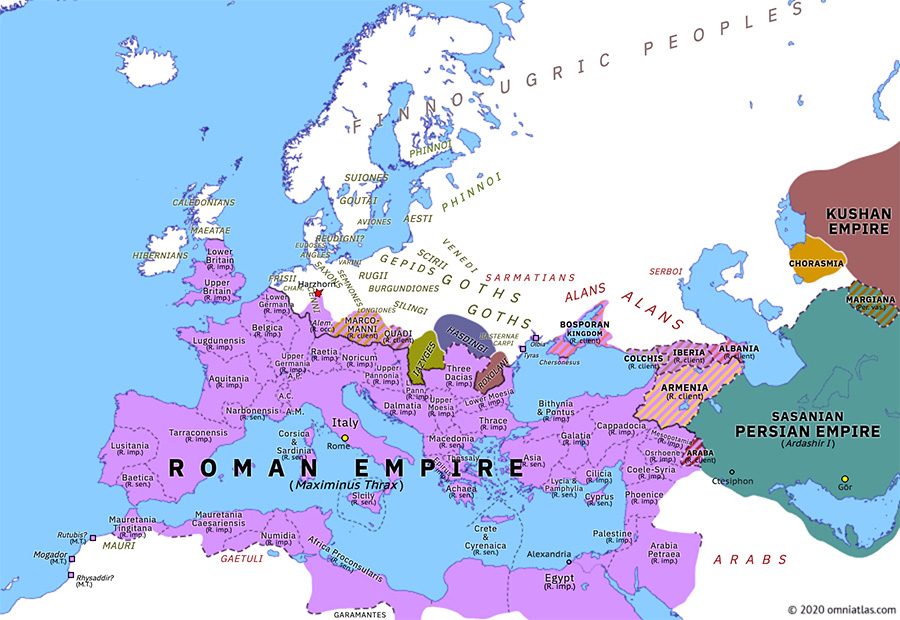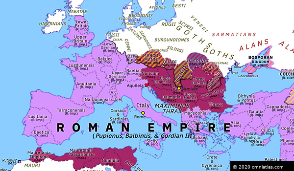 막시미누스 치세의 로마 제국. 그는 귀족을 싫어하고 알렉산데르의 측근이었던 고문들을 제거하기 시작했으며 그를 제거하려는 여러 음모가 실패로 돌아갔다. 235-236년에 알레만니를 시작으로 게르만 부족들을 물리쳤으며 다키아족과 사르마티아족과 싸웠다.