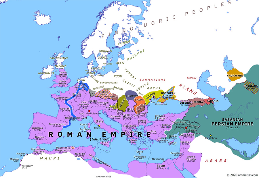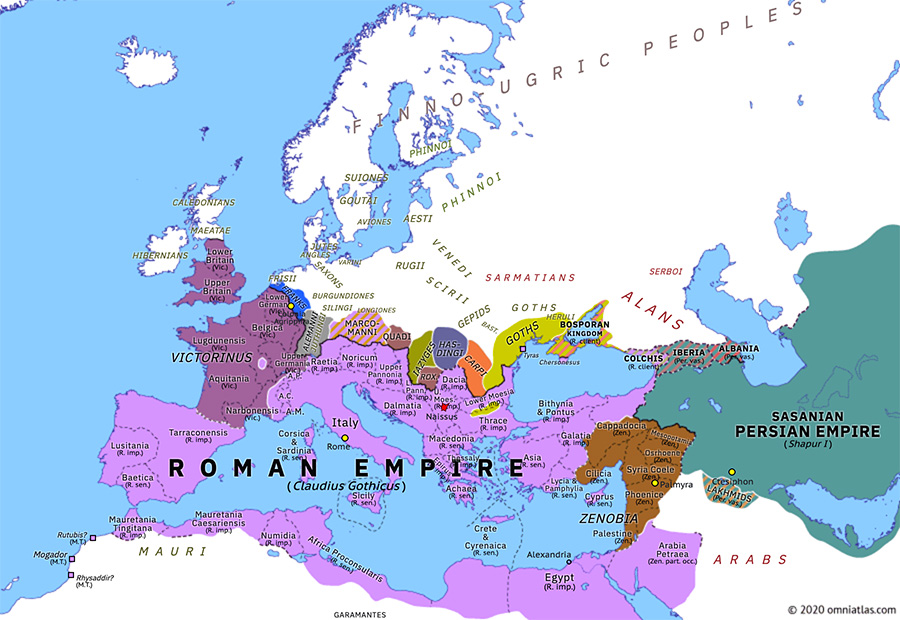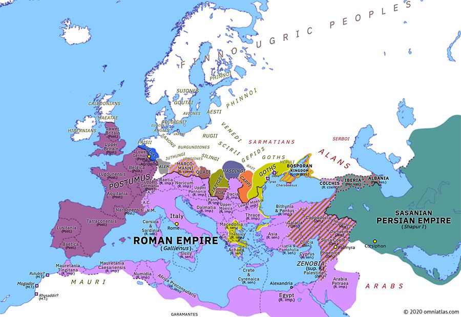 분열된 로마 제국. 반란의 여파로 포스투무스의 갈리아 제국이 형성되기 시작했고 페르시아 원정에서 승리한 오데나투스는 둑스 로마노룸의 칭호를 받고 에메사의 찬탈자 퀴에투스와 발리스타를 진압했다. 포스투무스는 콜로니아 아그리피나에 있던 황제의 아들 살로니누스를 죽이고 260년 9월 황제로 선포했다. 267-269년에 고트족과 다른 야만인들이 흑해에서 내려와 그리스의 많은 도시(아테네와 스파르타 포함)를 황폐화시켰고 헤룰리족의 함대가 주요 해군을 이끈 것으로 보인다. 268년 오데나투스가 암살되고 제노비아에게 권력이 넘어갔다.