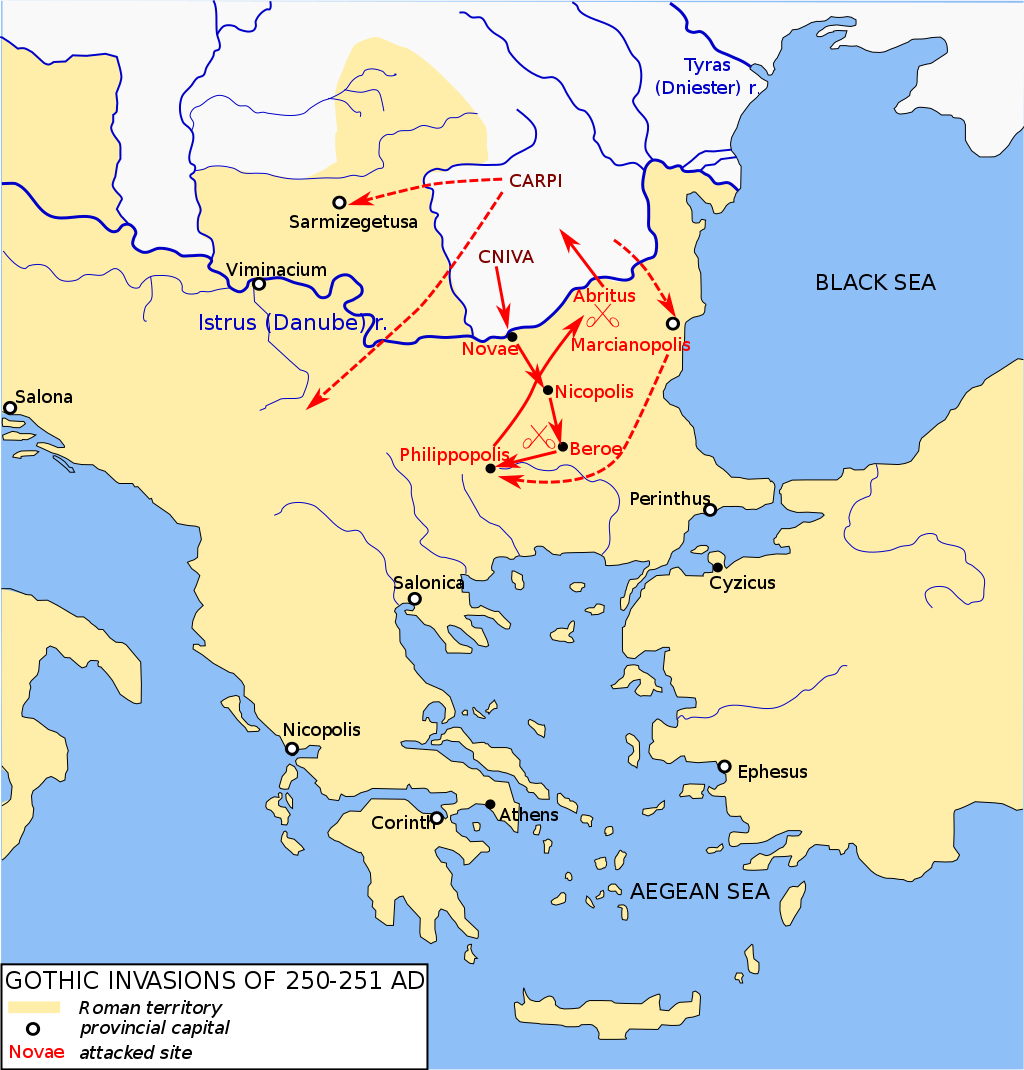 크니바가 이끄는 고트족이 모이시아와 트라키아를 침공하여 베로이(오늘날 스타라자고라)에서 로마군을 습격하여 승리하고 필리포폴리스(오늘날 플로브디프)를 점령했다. 고트족은 전리품과 포로를 싣고 고향으로 향했으며 포로 중에는 원로원 계급도 많았다. 데키우스가 그의 아들 헤렌니우스 에트루스쿠스와 장군 트레보니아누스 갈루스와 함께 군대를 이끌었다. 251년 6월 둘째 주, 아브리투스 소규모 정착촌 근처 루도고리에의 늪지대에서 크니바가 이끄는 고트족이 로마군에 맞서 전투를 벌였다. 헤렌니우스 에트루스쿠스는 화살에 맞아 전사했다고 기록되며 데키우스 역시 늪에 발이 묶여 군대가 전멸당하고 황제도 전사했다.