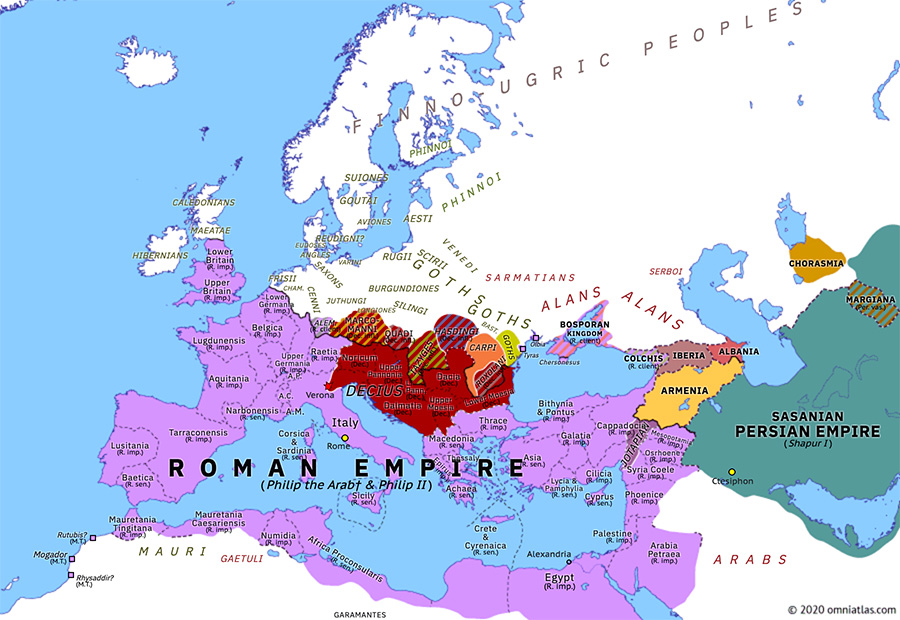 필리푸스 아라브스와 데키우스 치세의 로마 제국. 이집트에서 폭동이 일어나고 재정난에 빠진 필리푸스는 안토니니아누스의 가치를 하락시켰으며 로마의 밀 공급에 지장이 생겨 인기가 하락했다. 반란을 진압한 데키우스는 불만이 커진 휘하 군대에 의해 황제로 선포되어 베로나 부근에서 필리푸스에게 승리를 거두고 그를 죽였다.