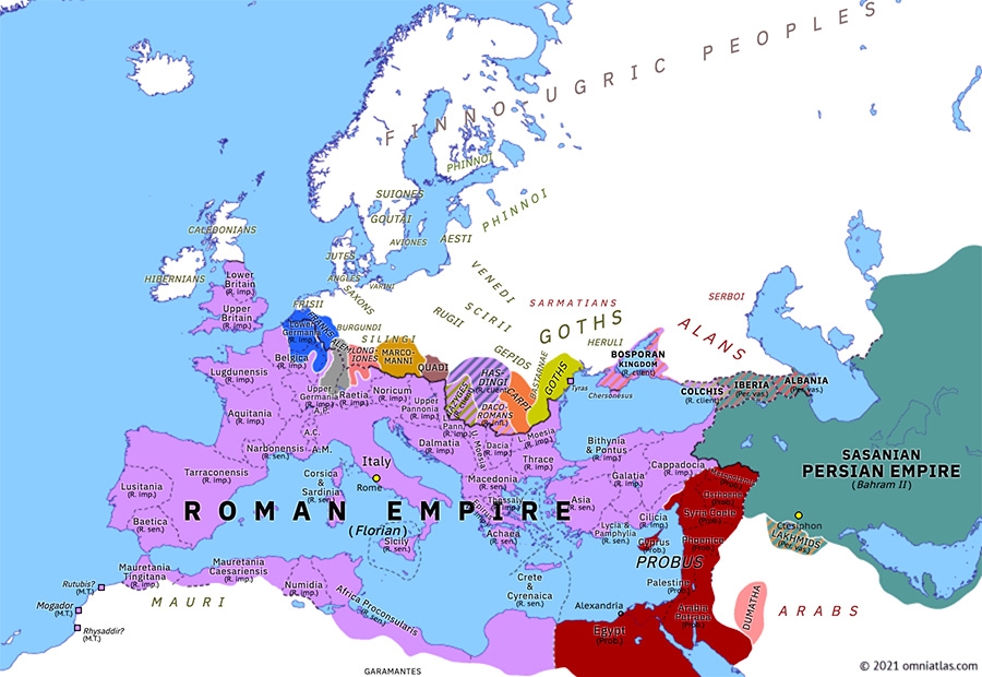 타키투스 치세의 로마 제국. 동방 원정을 위해 전임 황제가 모집한 야만족 용병이 원정이 취소된 후 동부 속주의 여러 도시를 약탈했다. 이들을 물리치고 프랑크족과 알레만니족의 갈리아 침공을 처리하기 위해 서쪽으로 향하던 중 276년 6월 카파도키아의 티아나에서 타키투스 황제는 열병으로 사망했다. 음모로 살해되었다는 주장도 있다.