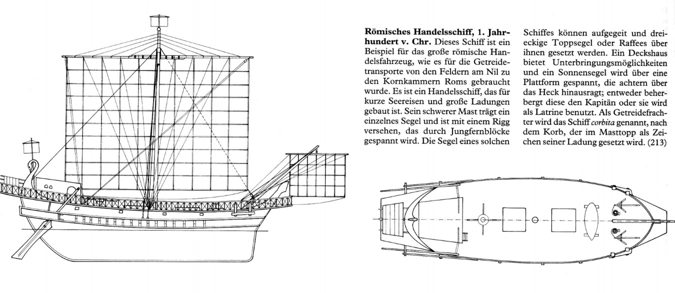 전형적인 로마 선박 또는 바지선은 배의 전면을 향해 장착된 하나의 돛으로 추진되었다. 중심이 되는 선미재 방향타는 아직 발명되지 않았기 때문에 진로는 선미 우측에서 돌출된 큰 노(배의 조종대 또는 '우현' 측) 또는 양 측면에 있는 노 방향타로 이루어졌었다.