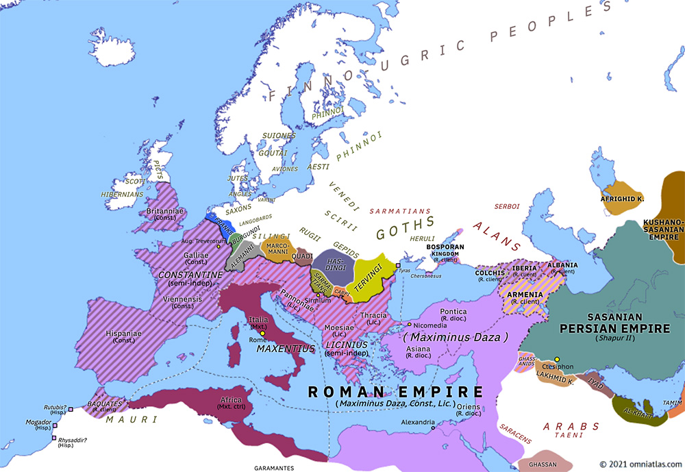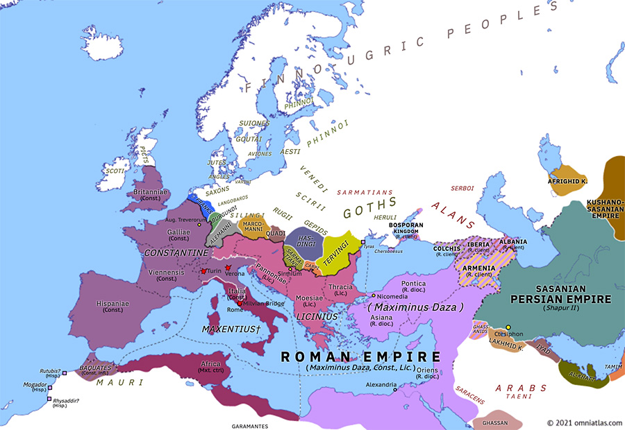 갈레리우스 황제 사망 후 로마 제국의 모습. 막시미누스가 소아시아를 점령하고 보스포루스에서 리키니우스와 급하게 평화조약을 맺었다. 콘스탄니누스가 갈리아와 브리타니아를 순방하는 동안 막센티우스는 전쟁을 준비하며 이탈리아 북부를 요새화 하고 에우세비우스 로마 주교를 선출하여 기독교의 지지를 강화했다. 당시 지역 간 여행이 불가능해지고 도처에 군사력이 증강되었다는 기록이 남아 있다.