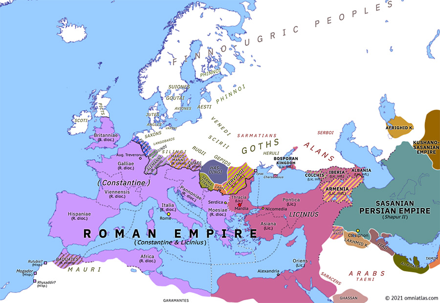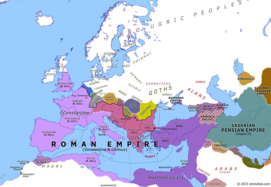 315년 트라키아의 마르디아 전투에서 승리를 거둔 콘스탄티누스는 이후 리키니우스와 화해했고 리키니우스는 공동 황제 발렌스를 처형했다.