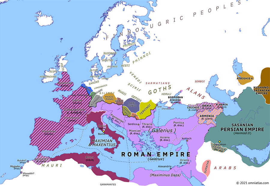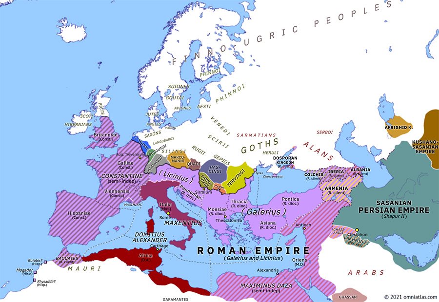 다시 분열된 로마 제국. 308년 카르눈툼에서 회의를 소집하여 디오클레티아누스, 갈레리우스, 막시미아누스가 참석해 아우구스투스와 카이사르를 다시 정했지만 결과에 반발하면서, 제각기 아우구스투스를 주장하고 서로의 영역을 통치하였다. 갈레리우스 황제 말년의 제국은 역사상 마지막으로 6명의 황제가 통치하게 되었다.