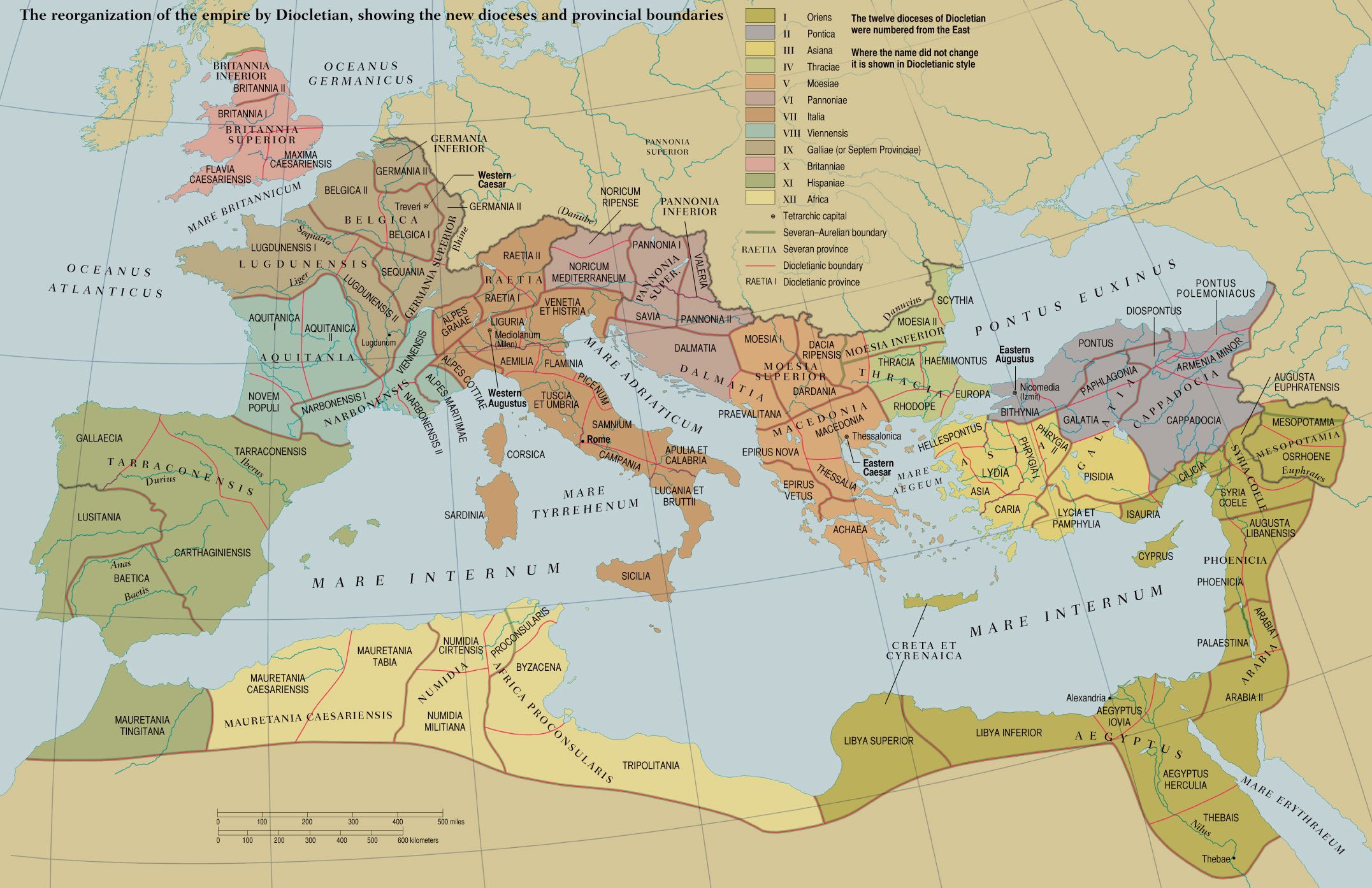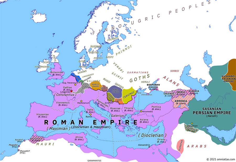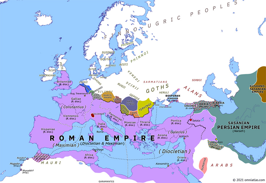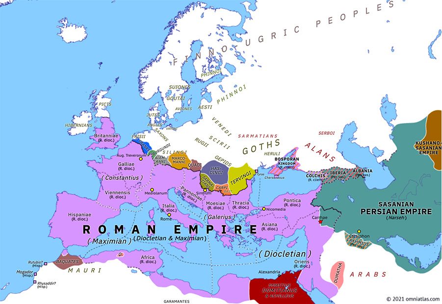 가이우스 아우렐리우스 발레리우스 디오클레티아누스는 달마티아에서 낮은 신분의 집안에서 태어나 군대를 거쳐 카루스 황제의 군대 기병 사령관이 되었다. 페르시아 원정에서 카루스와 그의 아들 누메리아누스가 죽은 후, 디오클레티아누스는 황제로 선포되었다. 카루스의 아들 카리누스도 황제를 주장했지만, 디오클레티아누스는 마르구스 전투에서 그를 물리쳤다. 디오클레티아누스의 통치는 제국을 안정시켰고 3세기 위기의 종식을 알렸다. 그는 286년 동료 장교 막시미아누스를 공동 황제 아우구스투스로 임명했다. 디오클레티아누스는 제국 동부에서, 막시미아누스는 제국 서부에서 통치했다. 디오클레티아누스는 293년 3월 1일 갈레리우스와 콘스탄티우스를 자신과 막시미아누스 휘하의 공동 황제(각각 카이사르 칭호를 받음)로 임명하였다. 테트라르키아(사두정치) 또는 "사분통치" 하에서, 각 황제는 제국의 4분의 1을 통치했다. 디오클레티아누스는 제국의 국경을 확보하고 권력에 대한 모든 위협을 제거했다. 그는 285년에서 299년 사이의 여러 원정에서 사르마티아인과 카르피족을, 288년에 알레만니족을, 그리고 297년에서 298년 사이에 이집트의 찬탈자들을 물리쳤다. 갈레리우스는 디오클레티아누스의 도움을 받아 제국의 전통적인 적인 사산조 페르시아에 맞서 성공적인 캠페인을 벌였다. 299년에 그는 사산 제국의 수도 크테시폰을 약탈했다. 디오클레티아누스는 후속 협상을 이끌었고 지속적이고 우호적인 평화를 달성했다. 디오클레티아누스는 제국의 민간 및 군사 임무를 분리하고 확장했으며 제국의 속주 분할을 재정비하여 제국 역사상 가장 크고 가장 관료적인 정부를 수립했다. 그는 전통적인 수도 로마보다 제국의 국경에 더 가까운 니코메디아, 메디올라눔, 시르미움, 트레보룸에 새로운 행정 중심지를 세웠다. 전제주의를 향한 3세기 경향을 바탕으로, 그는 자신을 전제 군주로 칭하면서, 위풍당당한 형태의 궁정 의식과 건축으로 제국의 대중보다 자신을 높였다. 관료주의적이고 군사적인 성장, 지속적인 캠페인과 건설 사업은 국가의 지출을 증가시켰고 포괄적인 세제 개혁이 필요했다. 적어도 297년부터, 제국의 세금은 표준화되었고, 더 공평해졌으며, 일반적으로 더 높은 세율로 부과되었다. 디오클레티아누스의 모든 계획이 성공적인 것은 아니었다. 가격 통제를 통해 인플레이션을 억제하려는 그의 시도인 최고 가격에 대한 칙령(301년)은 역효과를 내고 빠르게 무시되었다. 비록 그가 통치하는 동안 효과적이었지만, 디오클레티아누스의 사분통치 체제는 막시미아누스의 아들 막센티우스와 콘스탄티우스의 아들 콘스탄티누스의 경쟁적인 왕조 주장에 따라 그의 퇴위 이후 붕괴되었다. 기독교에 대한 제국의 마지막이자 가장 크고 가장 유혈이 낭자한 공식적인 디오클레티아누스 박해(303-312년)는 제국에서 기독교를 없애는 데 실패했다. 실제로 324년 이후 기독교는 콘스탄티누스 치세에서 제국이 선호하는 종교가 되었다. 이러한 실패와 도전에도 불구하고, 디오클레티아누스의 개혁은 로마 제국 정부의 구조를 근본적으로 바꾸었고, 경제적으로 그리고 군사적으로 제국의 안정을 도왔으며 디오클레티아누스의 젊은 시절, 붕괴 직전의 상황에 이르렀음에도 불구하고 제국은 150년 동안 본질적으로 온전하게 유지될 수 있었다. 병으로 쇠약해진 디오클레티아누스는 305년 5월 1일 황실을 떠났고 자진 퇴위한 최초의 황제가 되었다. 그는 은퇴 후 달마티아 해안에 있는 그의 궁전에서 채소밭을 가꾸며 살았다. 그의 궁전은 오늘날 크로아티아 스플리트의 핵심이 되었다.