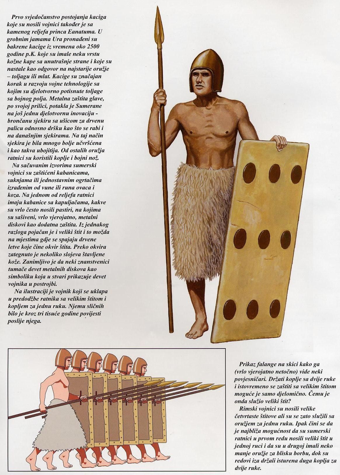 2천 년 동안 수메르 도시 국가 간의 거의 끊임없는 전쟁은 그 당시 근동의 다른 곳에서 발견된 유사한 발전을 훨씬 능가하는 군사 기술과 기술의 발전을 촉진시켰다. 상세한 증거가 있는 최초의 수메르 전쟁은 BC 2525년 라가시와 움마 사이에 일어났다. 이 분쟁에서 라가시의 에안나툼은 움마의 왕을 물리쳤다. 군사 역사가에게 이 전쟁의 중요성은 에안나툼이 그의 승리를 기념하기 위해 세운 기념비에 있다. 이 비석은 맹금류와 사자들이 사막 평원에 누워 있는 시체의 살을 찢고 있는 모습을 묘사하여 "독수리의 석비"라고 불린다. 그 비석은 수메르 시대의 전쟁에 대한 최초의 중요한 그림이 포함된 묘사를 나타내며, 라가시의 왕이 적을 짓밟을 때 창으로 무장한, 투구를 쓴 전사들로 이루어진 보병 팔랑크스를 이끄는 것을 묘사한다.