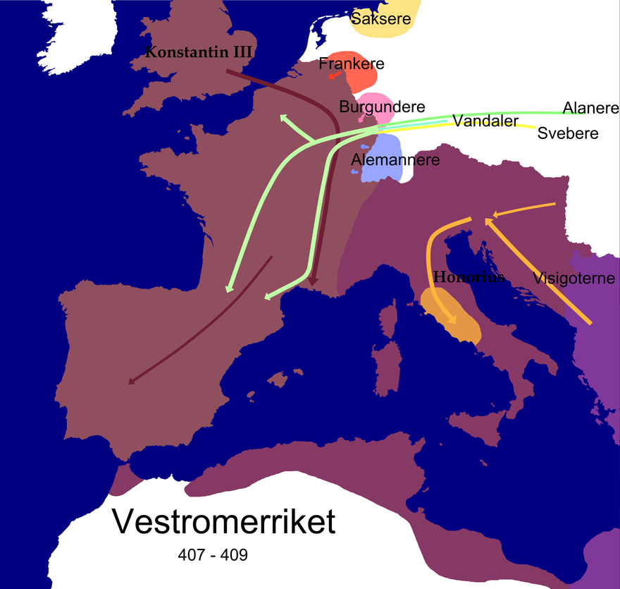 407년 황제를 자칭한 콘스탄티누스 3세는 브리타니아의 전군을 이끌고 갈리아로 향했다. 408년 황제의 장인 스틸리코가 몰락하면서 휘하 장교들이 알라리크의 서고트족에게 귀순했다. 이탈리아와 로마는 다시 서고트족의 침공을 받았다. 410년 호노리우스는 브리타니아로 편지를 보내 스스로를 지키라고 명령했다. 로마군이 모두 철수한 브리타니아의 사람들은 자구책을 마련해야 했다.