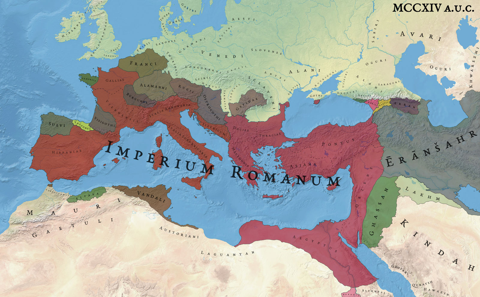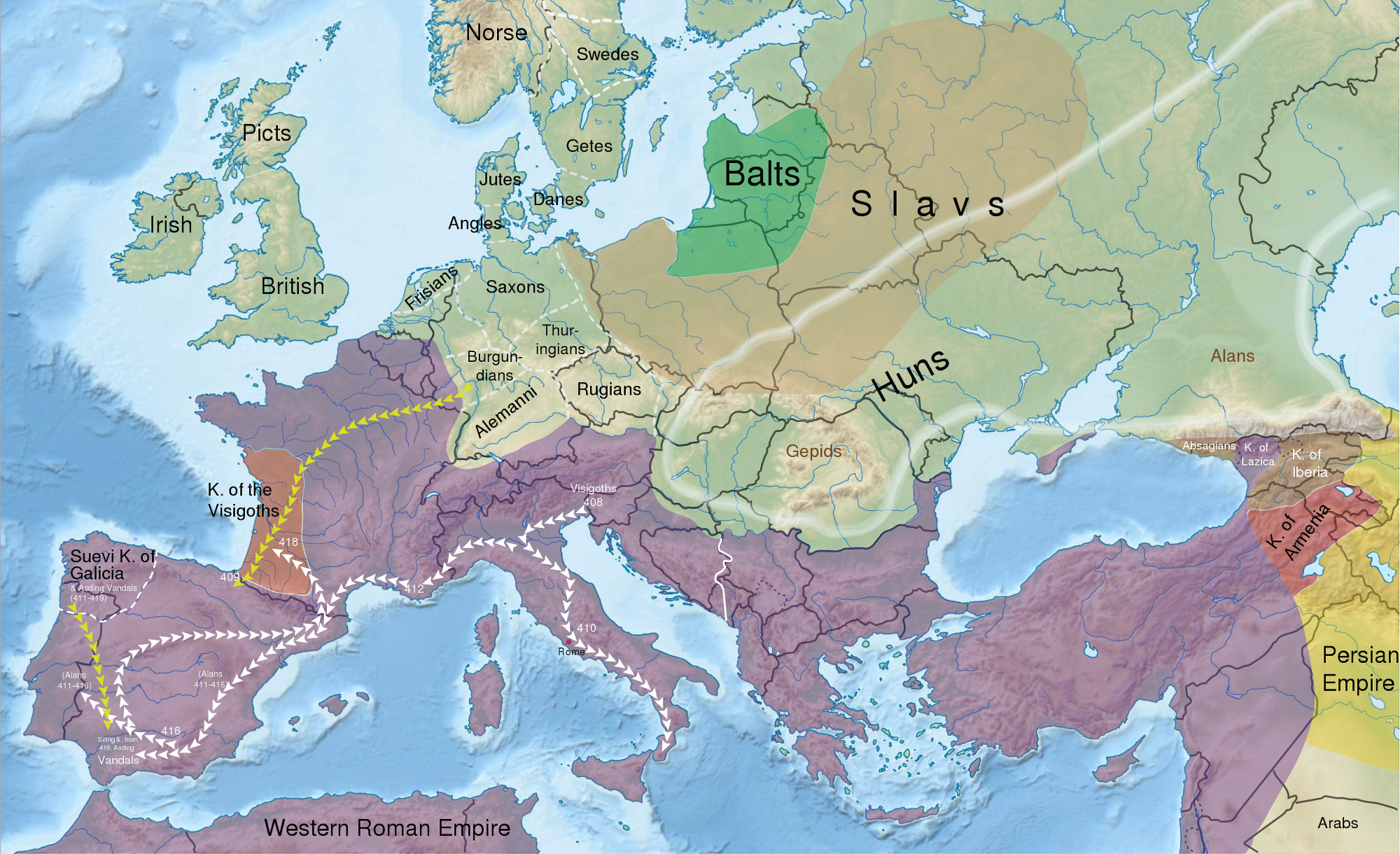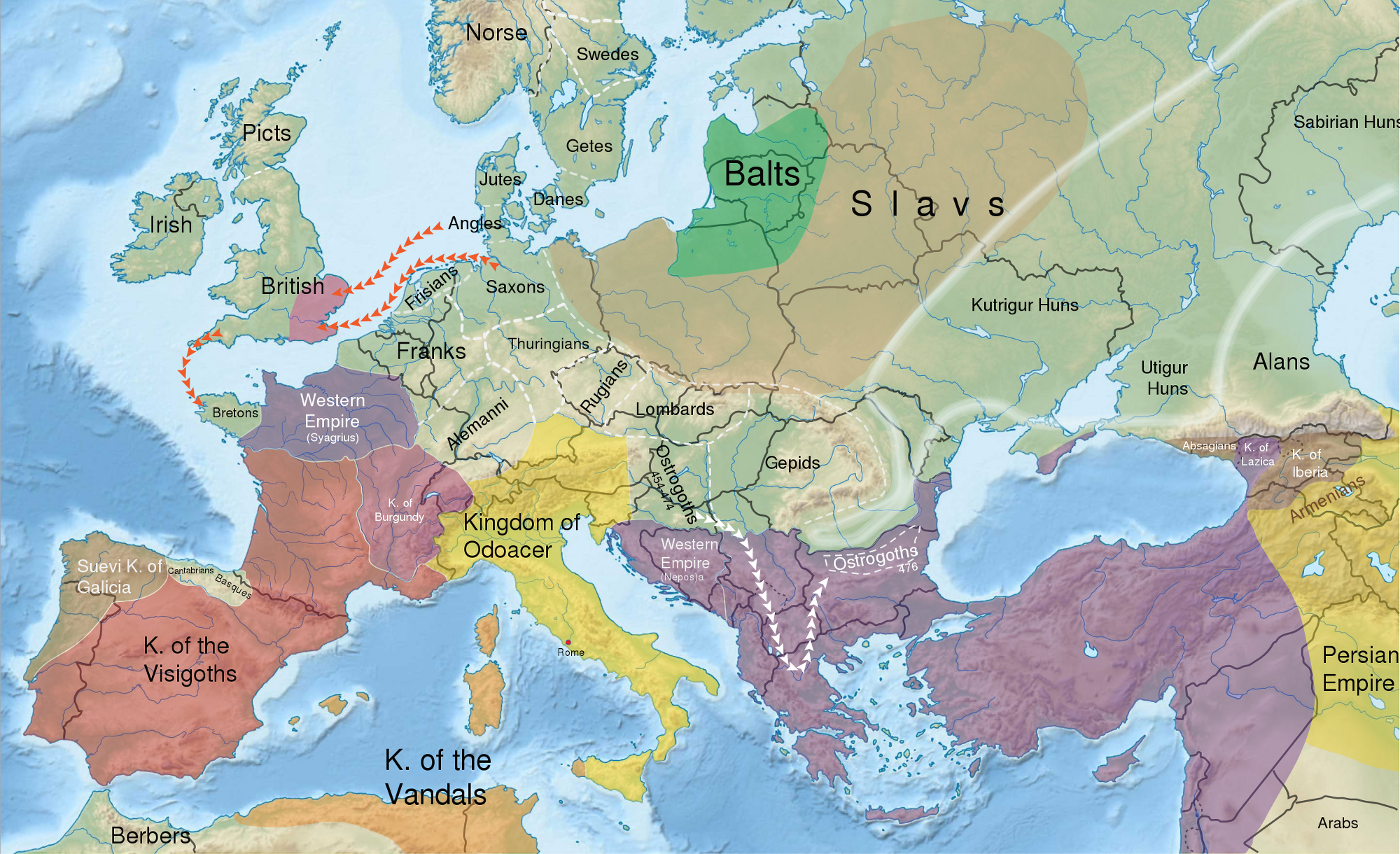 476년까지 이민족 침략을 나타낸 지도. 오도아케르가 로물루스를 퇴위시키고 왕이 되면서 동로마 제국을 종주국으로 받들었다. 달마티아에는 네포스 황제가 여전히 서부 제국을 주장하고 있었고 갈리아 북부도 공식적으로는 서부 제국의 일부였다. 실제로 서부 제국의 몰락은 후대 사람들이 생각하는 것보다 훨씬 더 조용하게 지나갔을 것이다.