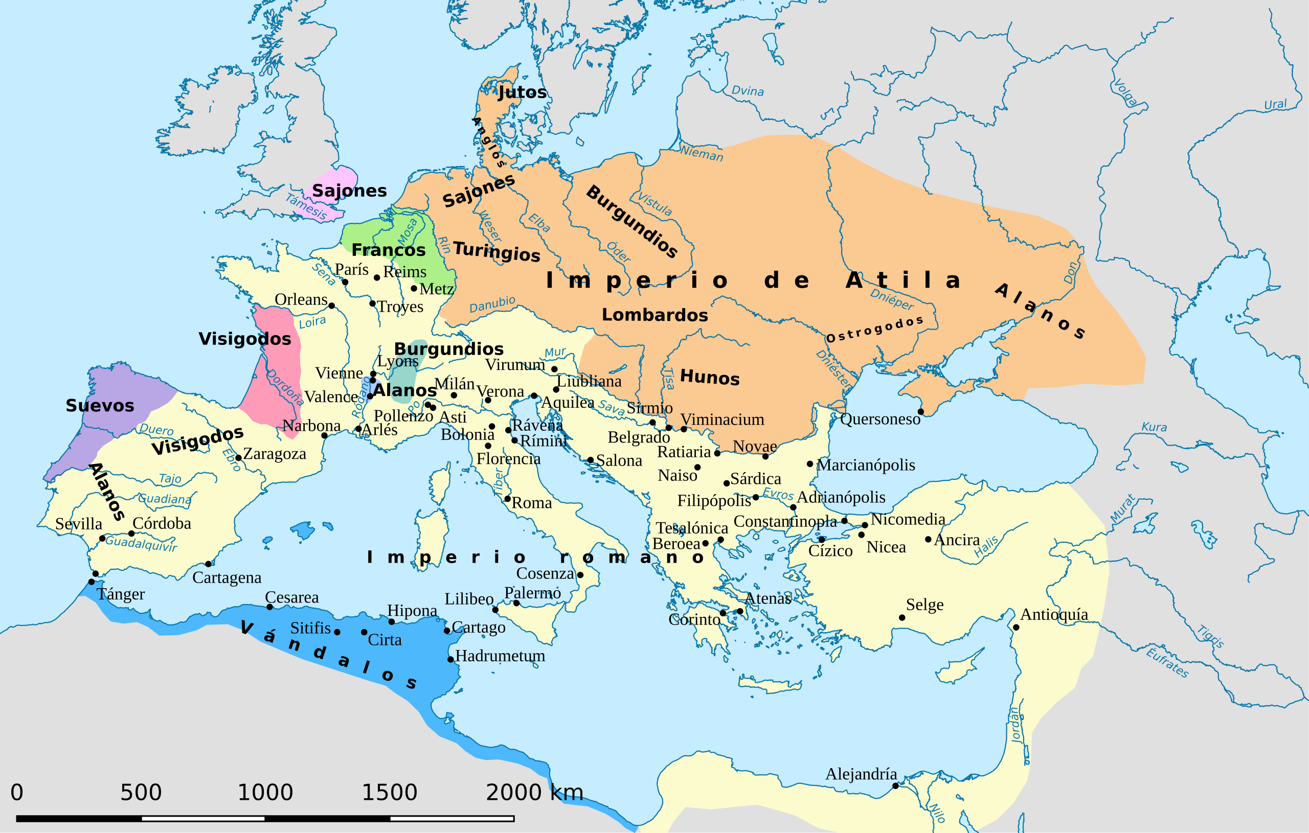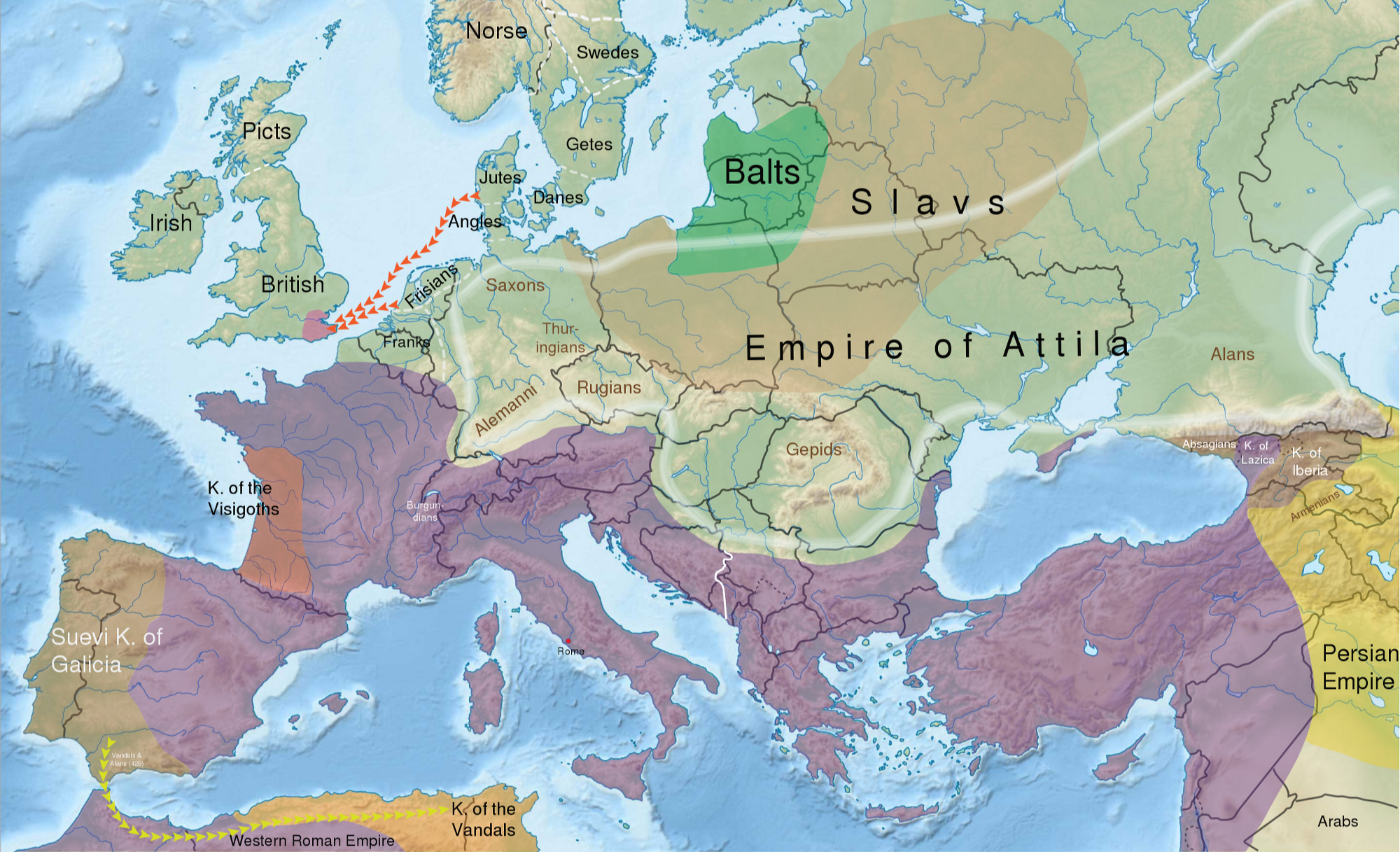 450년경 훈족 아틸라의 제국. 훈족이 441년부터 449년까지 다누비우스 지역을 압박하면서 서부 제국은 한숨 돌렸다. 449년 아틸라는 원치 않는 결혼에서 구해주면 서부 제국의 절반을 주겠다는 발렌티니아누스 3세의 누이 호노리아의 편지를 받게 된다. 침공 명분을 찾고 있던 아틸라는 450년 동부 제국과 화평을 하고 갈리아로 향했다. 격노한 황제는 호노리아의 심부름꾼을 잡아 모든 내용을 밝히는 고문을 하고 참수를 했다.
