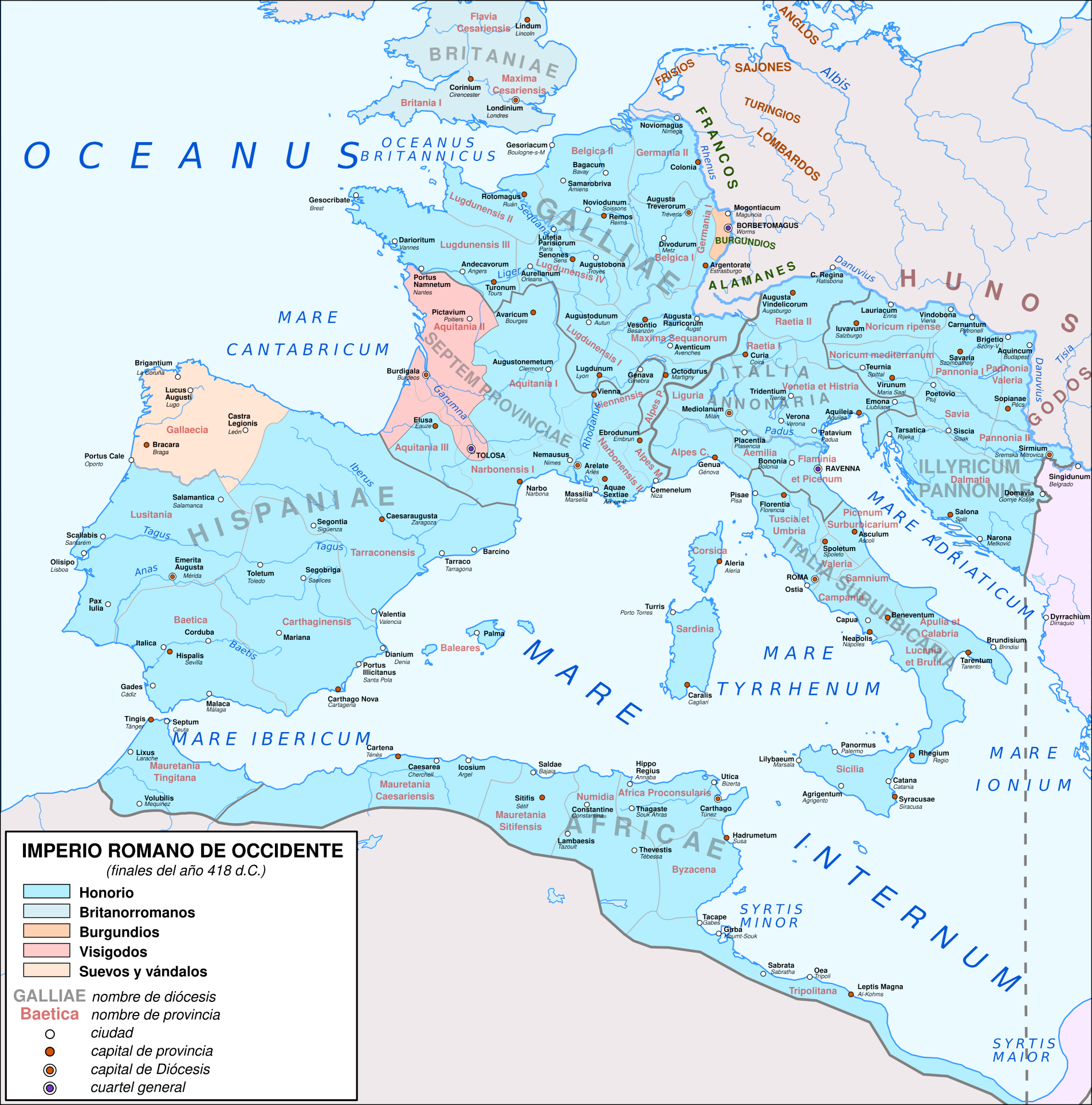 418년 서로마 제국의 모습. 브리타니아는 별개의 세력이 되었고 서고트는 갈리아 아퀴타니아 지역을, 수에비는 히스파니아의 북동부 갈라이키아를 차지했으며 갈리아 북동부는 프랑크의 영향력이 커지고 있었다. 또한 황제의 칙령으로 갈리아 지역의 속주는 중앙 정부와 연결이 완화되어 자체적으로 행정을 처리하게 되었고 매년 아를에서 모여 회의를 열었다.