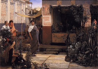 3. 로마는 연속된 공휴일이 있었고, 일 년의 절반은 일을 하지 않았으며, 경기와 행사는 물론 신전 옆에서 의식과 파티가 있었다. 결과적으로 모든 종류의 노점과 함께 크고 작은 박람회로 가득했다. 축제 기간 동안 요리를 했든 아니든, 음식, 음료, 봉헌 테라코타 조각상, 신의 상징, 도구, 꽃병, 그릇, 가죽 부대, 해당 신전 및 해당 축제의 기념품, 부적과 행운의 장식, 목재 제품, 청동, 구리, 철제, 스툴, 보석함, 목걸이, 팔찌, 발찌, 반지, 로마식 브로치 그리고 핀이 함께 판매되었다. 그 뒤에 이발사, 안마사, 향수, 향유, 오일 및 화장품 판매자와 포주, 중개상과 창녀들이 나왔다. 축제가 있는 사원들 옆의 노점은 물론 키르쿠스 옆, 포룸, 목욕탕, 황실 정원 근처에 있어서, 오늘날과 달리 그들은 항상 대중에게 개방되어 있어 어쨌든 사업은 이루어졌다. 이는 꽃집, 점쟁이, 재단사, 떠돌이 화장 전문가를 포함한 많은 장인과 행상인의 존재를 보장했다.