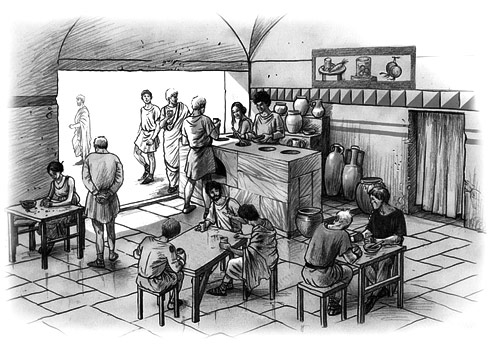 그래서 이탈리아 용어 타베르나는 다과점인 트라토리아에서 레스토랑까지 의미한다. 그러나 로마인 사이에서는 모든 소매상의 상점이기도 했다.
