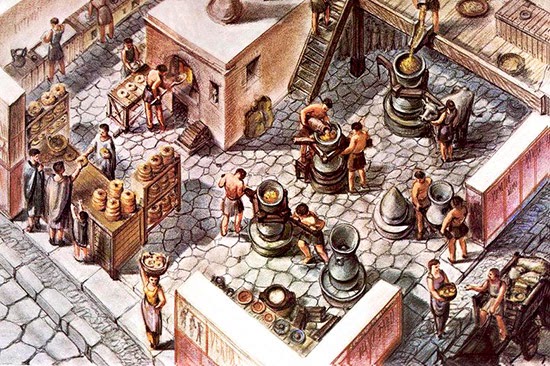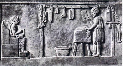 그러나 가장 많은 상점은 매우 무거운 맷돌로 곡물을 갈아 빵을 굽고 판매하는 제빵사들의 가게였다. 보통 노새가 끄는 맷돌 외에도 화덕과 반죽 장치가 있었는데, 화덕은 돌이나 구운 벽돌, 반죽기는 돌로 만들었다.