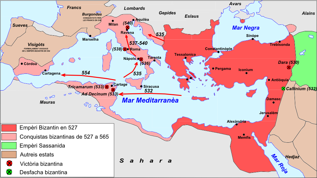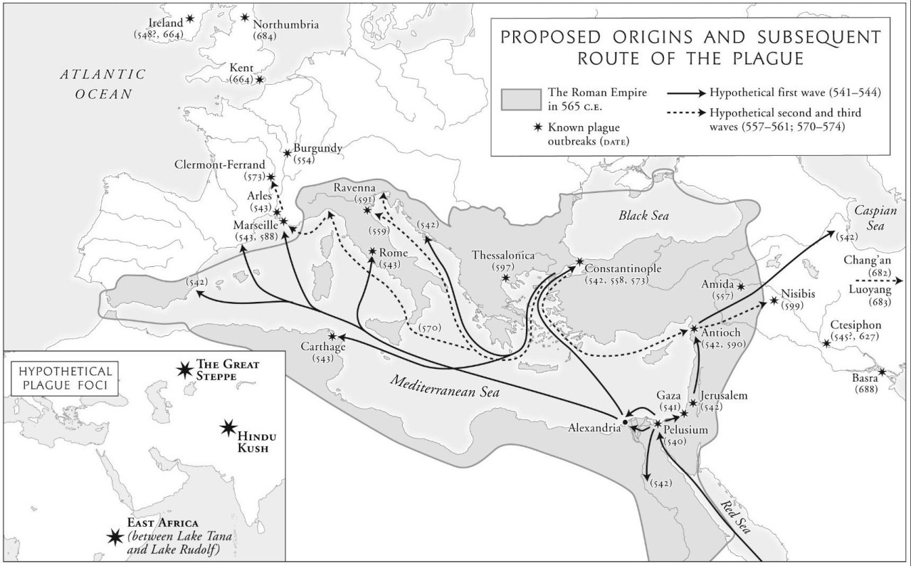 유스티니아누스 전염병. 이 질병은 지중해 지역 전체, 유럽, 근동을 괴롭혔고 사산 제국과 비잔틴 제국, 특히 콘스탄티노플에 심각한 영향을 미쳤다. 궁정 역사가 프로코피우스에 따르면 그 역시 병에 걸렸다가 542년 회복했다고 하며 수도의 인구 약 1/5을 사망케 했다. 전염병은 541년 로마 이집트에 도착해 544년까지 지중해를 중심으로 퍼졌고 549년까지 북유럽과 아라비아 반도에서 지속되었다.