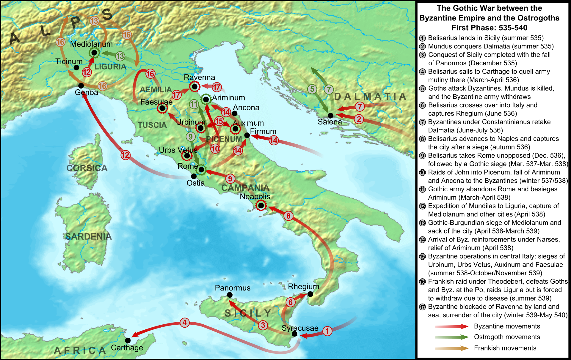 535년 12월 말에 벨리사리우스는 시칠리아를 점령했다. 536년 문두스가 달마티아를 제압하여 살로나를 점령했지만 동코트의 대군이 도착하여 문두스의 아들 마우리키우스가 전사하고 문두스는 후퇴하면서 치명상을 입었다. 유스티니아누스 황제는 마기스테르 밀리툼 페르 일리리쿰으로 콘스탄티니아누스를 임명하여 달마티아를 신속하게 회복했다. 동고트의 장군 그리파스는 방어시설이 파괴되고 시민들이 친로마 성향으로 피난하면서 살로나를 포기했다. 콘스탄티니아누스는 도시를 점령하고 성벽을 재건했다. 536년 늦은 봄, 이탈리아로 건너간 벨리사리우스는 11월에 3주간의 포위 끝에 네아폴리스를 점령하고 도시를 약탈했다. 12월에 저항 없이 로마에 입성하자 동고트는 깜짝 놀랐고 라벤나에서 군대를 모으기 시작했다. 538년 나르세스가 이탈리아에 도착하여 아리미눔 구원을 주장하였고 요안네스의 편지에 도시로 진격했다. 포위를 우려한 동고트군이 철수하고 아리미눔에 비잔틴군이 무혈입성하면서 나르세스의 입지가 강화되었다. 538년 4월 메디올라눔에 1천 명의 군대를 보내자 동고트가 프랑크인에게 원군을 요청하여 부르군트에서 1만 명의 군대가 알프스를 넘어왔다. 연합한 동고트는 메디올라눔을 포위하여 539년 3월 말에 도시를 점령하고 파괴하고 주민을 학살했다. 540년 5월 벨리사리우스의 군이 동고트의 수도 라벤나에 입성했으나 도시의 약탈은 없었다.