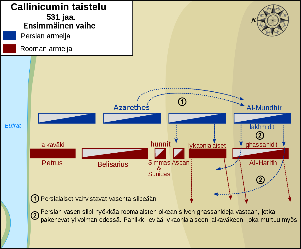 531년 4월, 사산 제국은 1만 5천의 아스와란 기병과 5천의 라큼 기병으로 이루어진 군대를 요새화 된 도시를 피해 원정 보냈다. 페르시아군이 칼리니쿰에 근접했을 때, 벨리사리우스가 그들을 향해 진군했다. 비잔틴군은 1만 5천의 보병과 기병, 5천의 가산 기병으로 구성되었으며 아마도 전투는 부활절 일요일에 일어났을 것이기 때문에 낮부터 밤까지 금식해야 했고 병사들은 배고픈 상태였다. 페르시아의 지휘관 아자레테스는 기독교 군대의 금식을 예우하기 위해 전갈을 보냈고 벨리사리우스 역시 금식일 이후를 원했지만 연이은 승리에 비잔틴 군대는 전투를 원했다. 페르시아군은 좌익으로 기병을 더 보내 비잔틴의 우익을 공략했다. 가산 기병은 쉽게 퇴각했고 리카오니아 보병대의 측면이 노출되어 지휘관이 전사하고 패주했다.