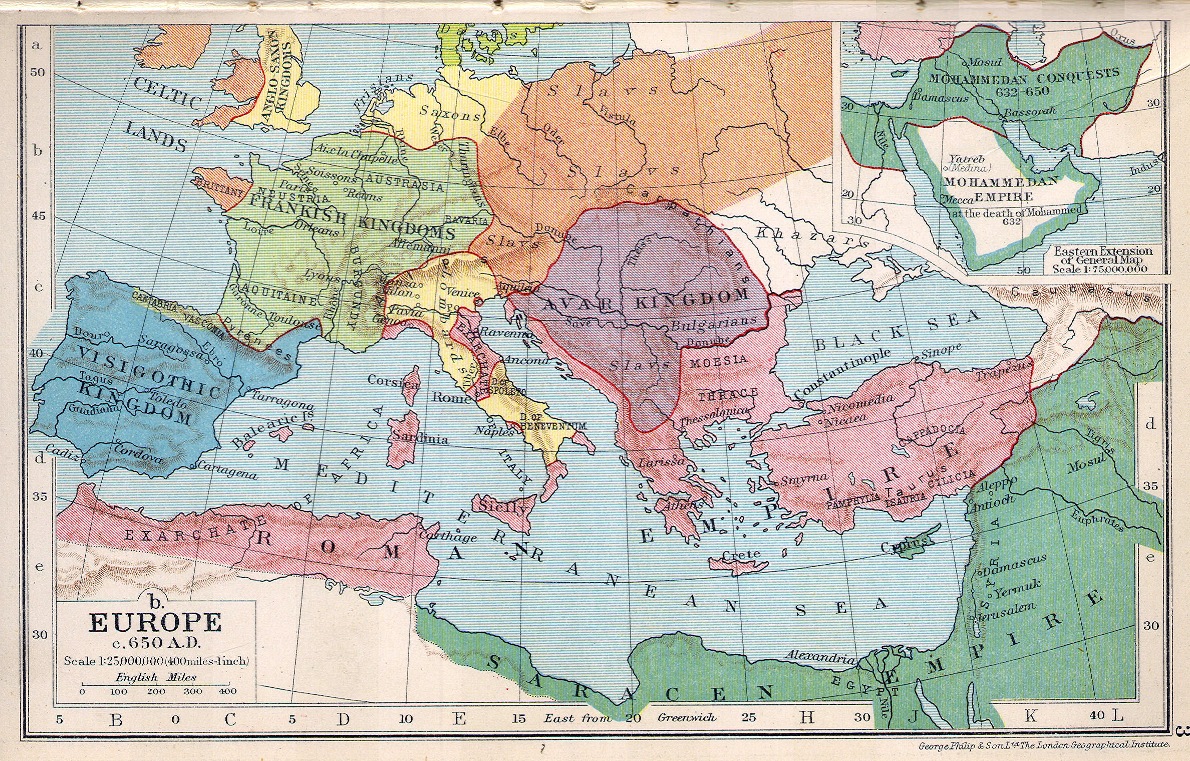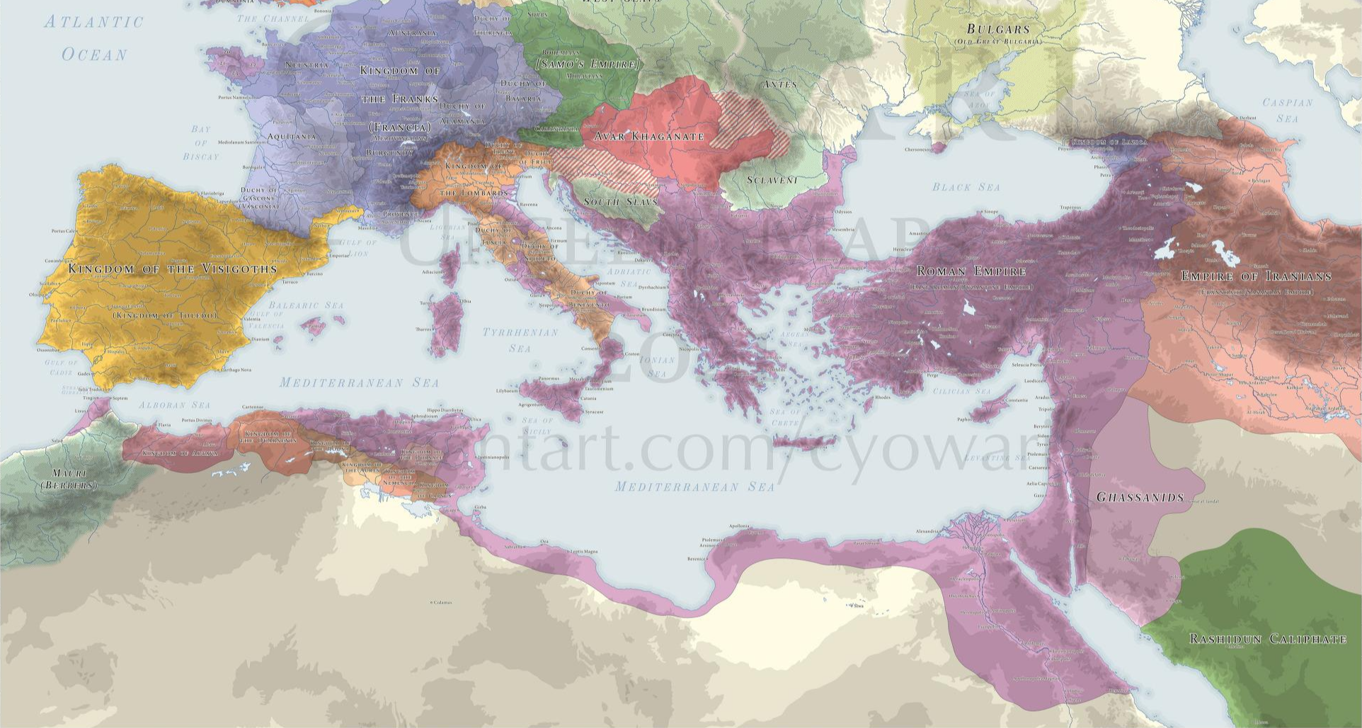 600년 비잔틴 제국. 마우리키우스가 제국을 회복하고 있었지만 포카스의 찬탈은 7세기 이슬람 세력이 발흥하게 된 원인 중 하나가 되었다.
