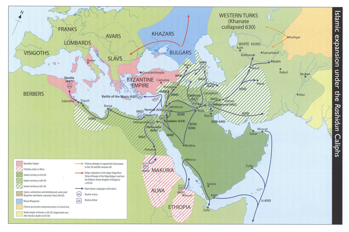 634년까지 이슬람 세력의 확장. 두 제국이 장기간 전쟁을 벌이고 있는 동안 분열되어 있던 아랍 부족을 예언자 무함마드가 통일했다. 632년 후계자를 정하지 않은 무함마드가 사망한 뒤, 아부 바크르는 초대 칼리파가 되어 이슬람 세력을 이끌었다.