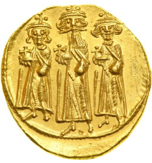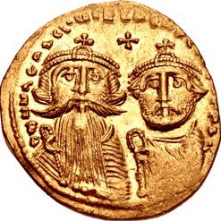 헤라클리우스 황제와 함께 있는 아들 헤라클리우스 콘스탄티누스(오른쪽)를 나타낸 주화. 종종 콘스탄티누스 3세로 열거되는 헤라클리우스 콘스탄티누스는 3개월 동안 짧게 통치한 황제였다. 그는 헤라클리우스 황제와 첫 번째 부인 에우도키아의 장남이다.