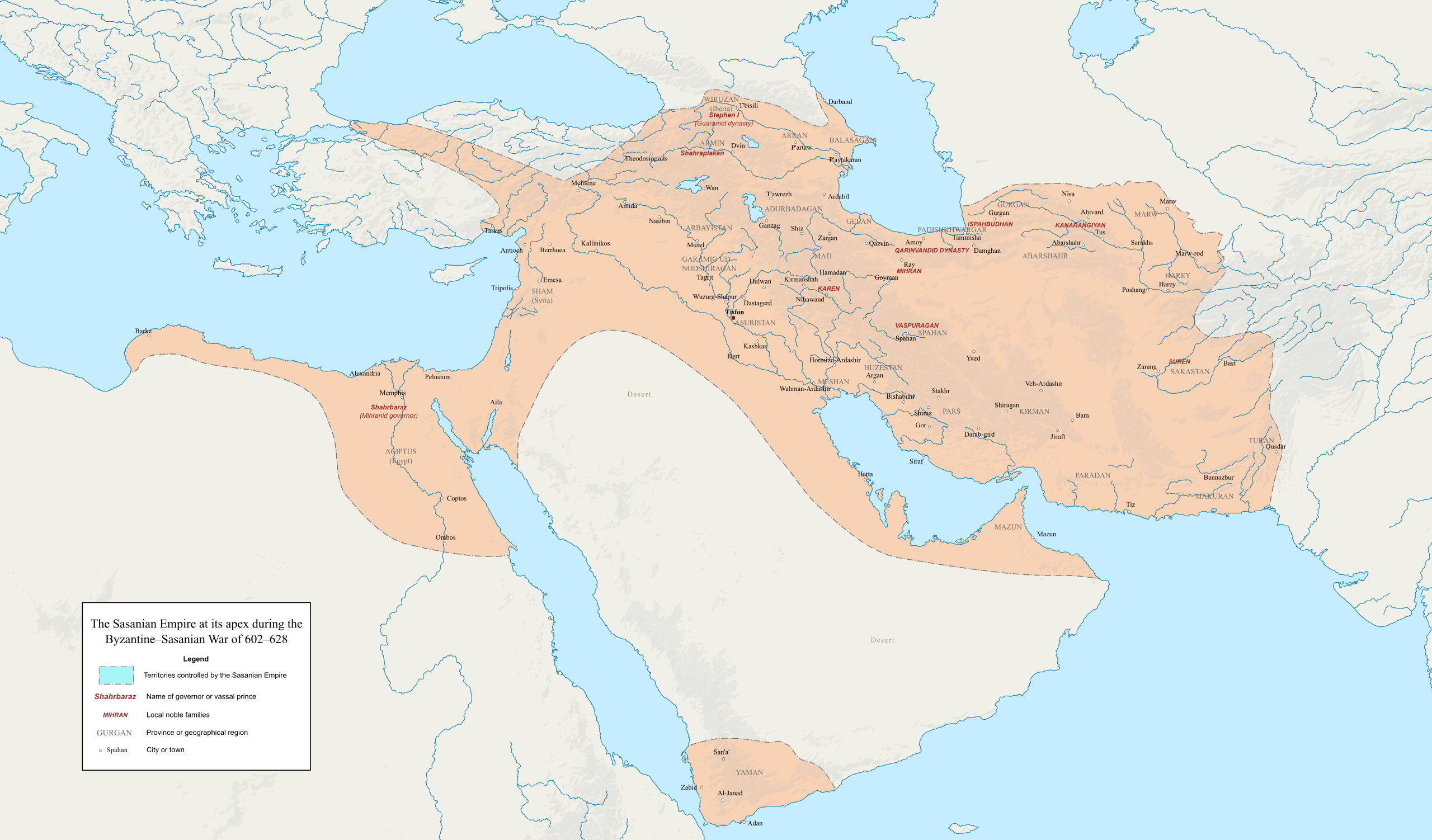 사산 제국의 최대 영토. 포카스의 찬탈 후, 사산 제국의 호스로 2세는 마우리키우스의 아들 테오도시우스를 주장하는 사람을 궁정에 두었다. 복권을 명분으로 비잔틴을 침공한 페르시아는 메소포타미아와 코카서스를 정복하고 611년에는 시리아를 정복하고 아나톨리아로 진입했다. 즉위한 헤라클리우스는 전쟁의 명분이었던 포카스를 타도한 것을 들면서 화해를 시도했지만 이미 많은 영토를 차지한 페르시아는 제안을 거부했다.